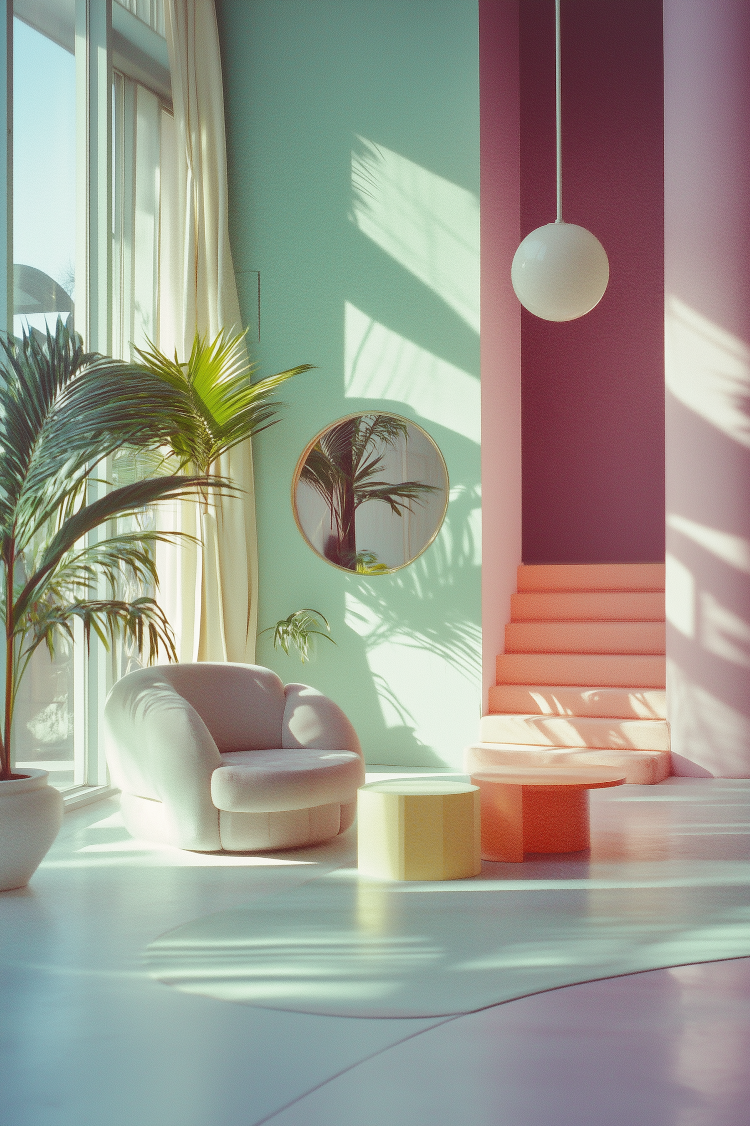 Stylish interior with pastel colors, featuring a plush armchair, palm plant, and modern decor elements in soft lighting.