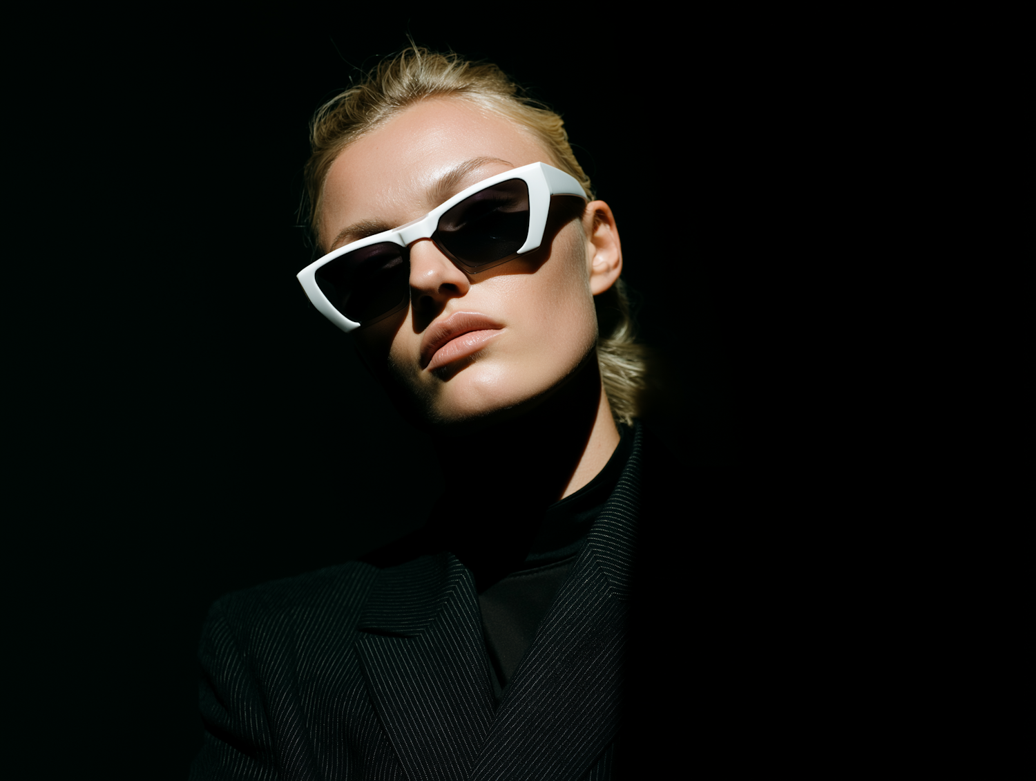 Chic woman in white angular sunglasses and black blazer, highlighted by dramatic lighting against a dark background.