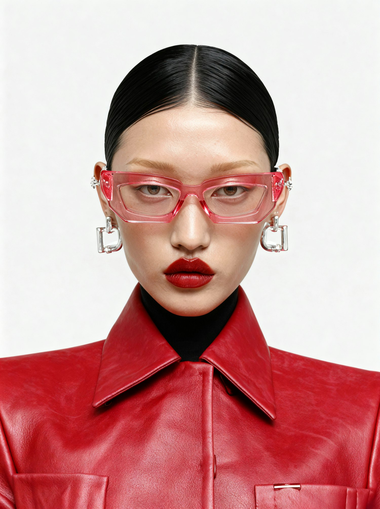 A stylish individual in a red leather jacket, pink glasses, and bold red lipstick, showcasing a modern and striking fashion look.