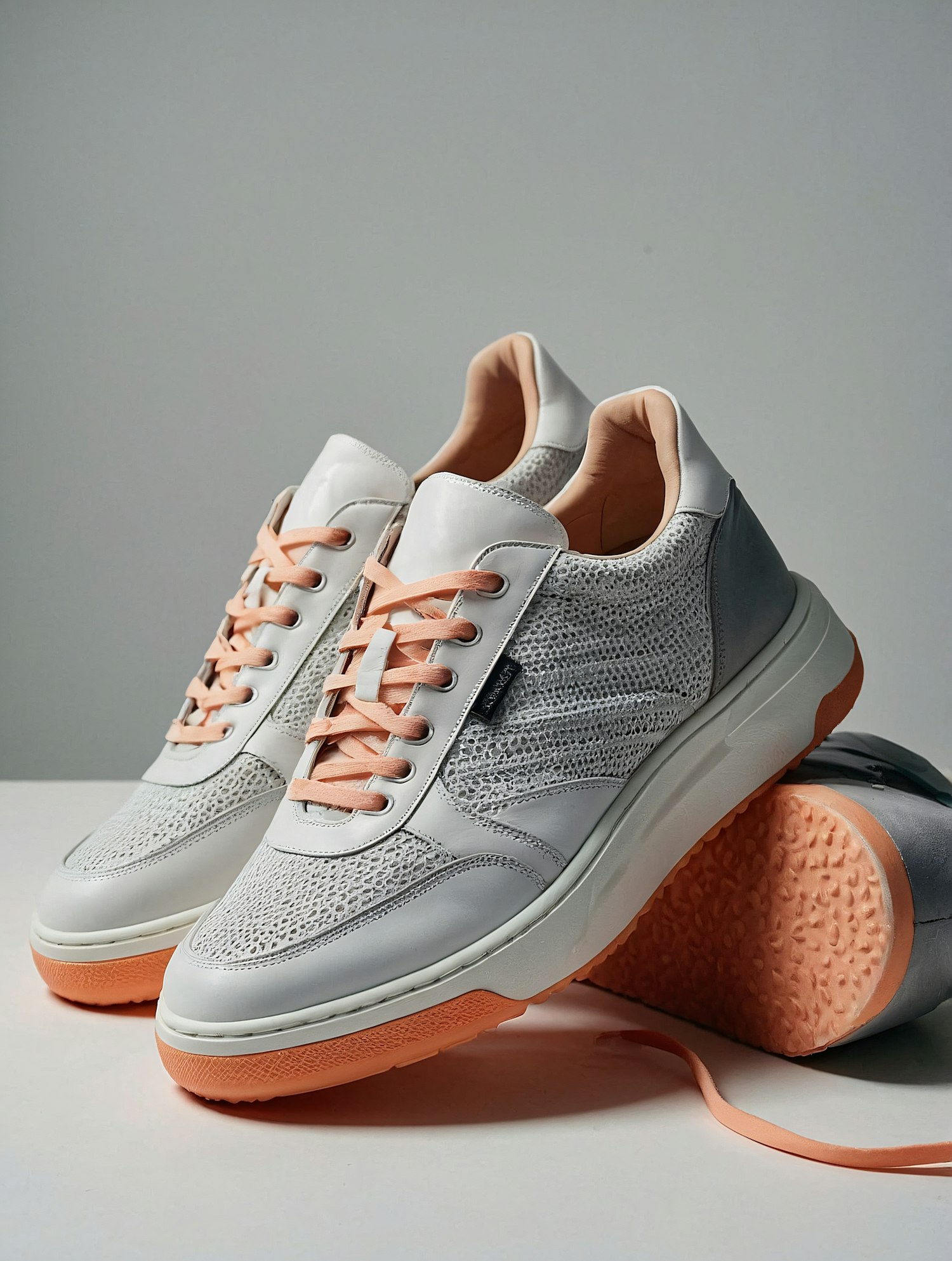 Light gray and white sneakers with peach laces and soles, featuring a breathable mesh design and textured grip for a modern look.