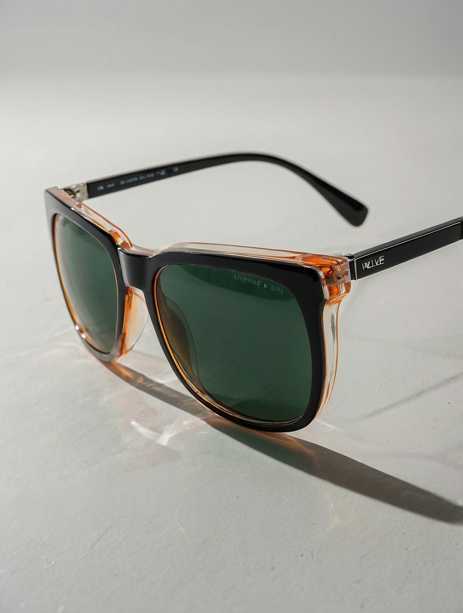 Modern sunglasses with amber and black frames, dark green lenses, and sleek branding, set on a light surface with soft shadows.