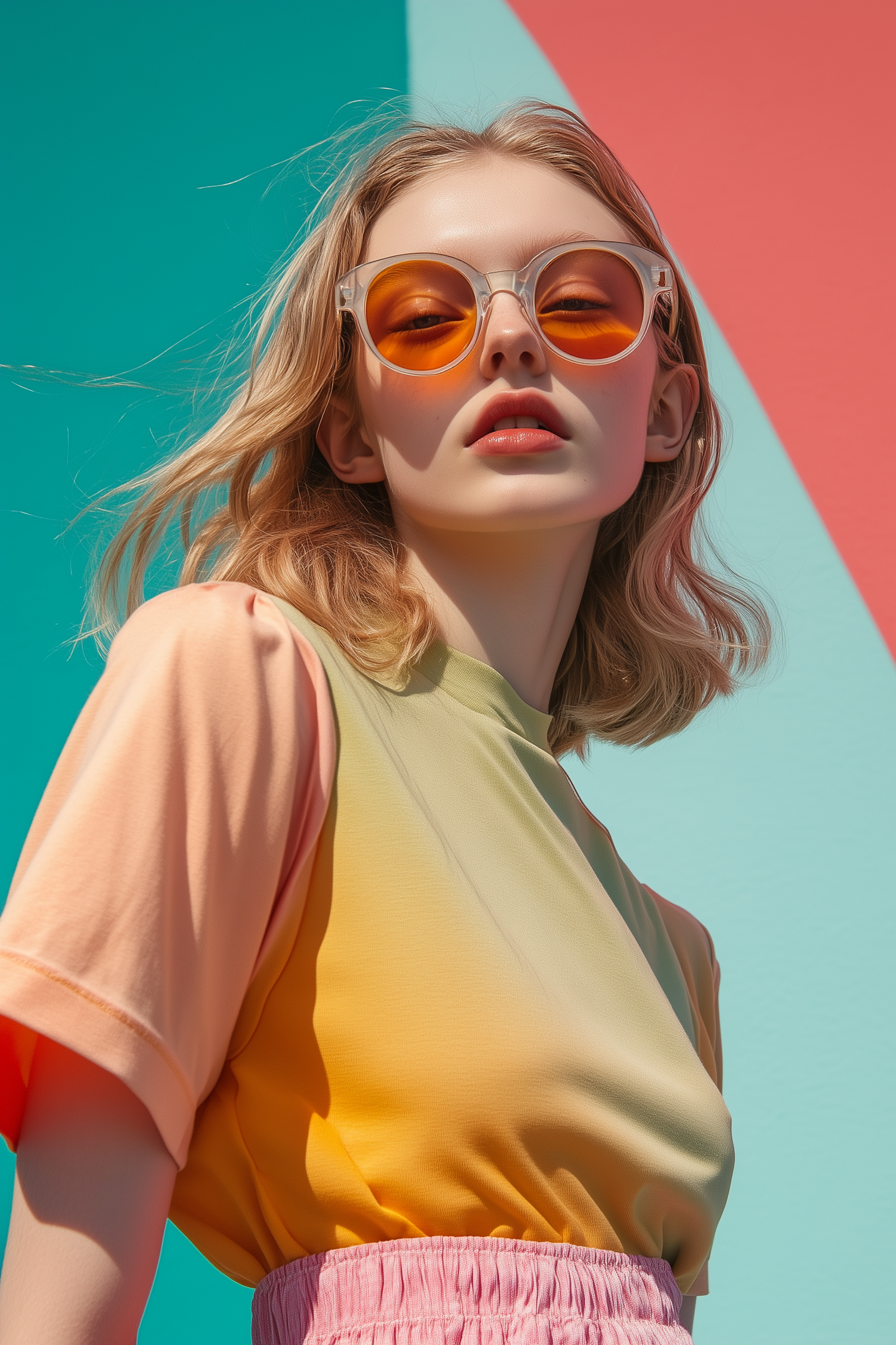 Stylish woman in orange-tinted sunglasses and pastel outfit against a bold teal and coral background. Perfect summer vibes!
