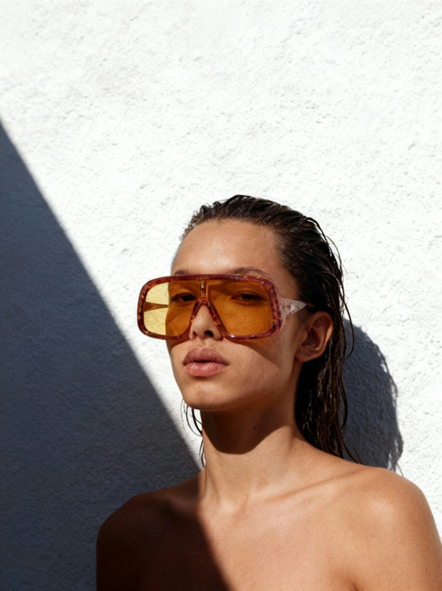 A person with wet hair and bold orange sunglasses stands against a white wall, with dramatic lighting and shadows enhancing the scene.