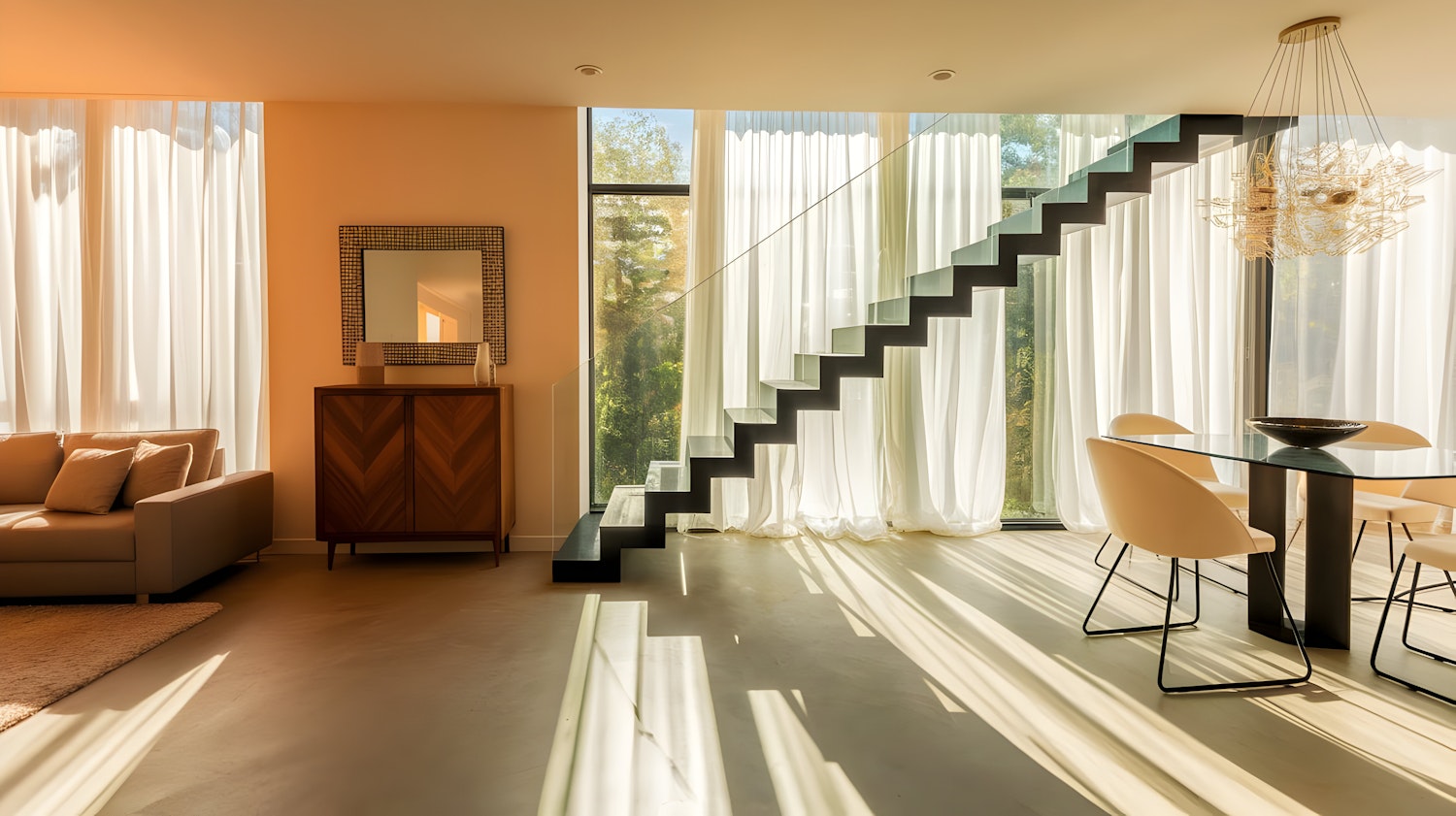 Bright modern living space with a black staircase, glass dining table, beige sofa, and floor-to-ceiling windows with sheer curtains.