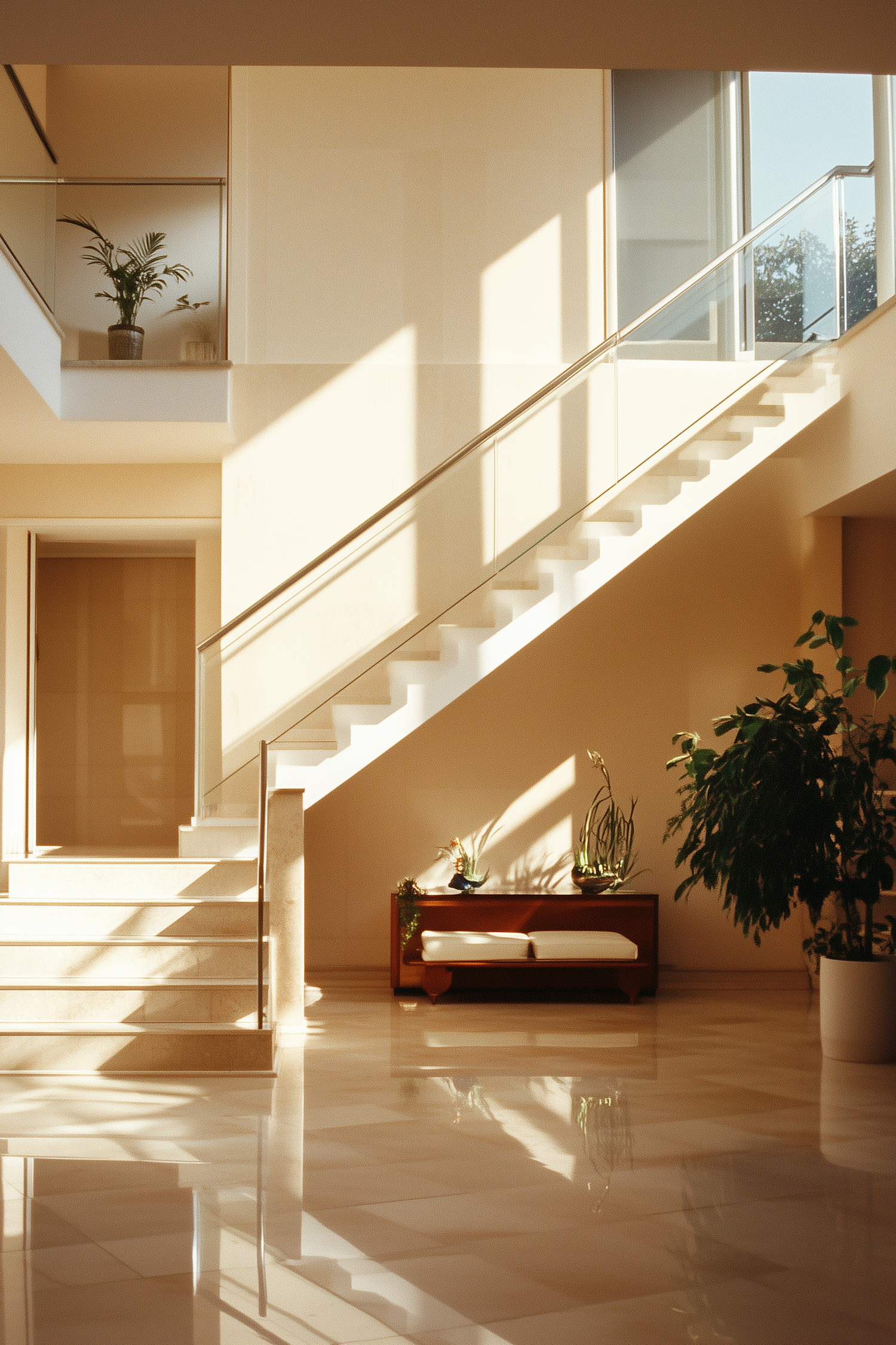 Modern interior with a sleek white staircase, glass railing, and warm lighting. Minimalist decor with plants and a wooden bench.