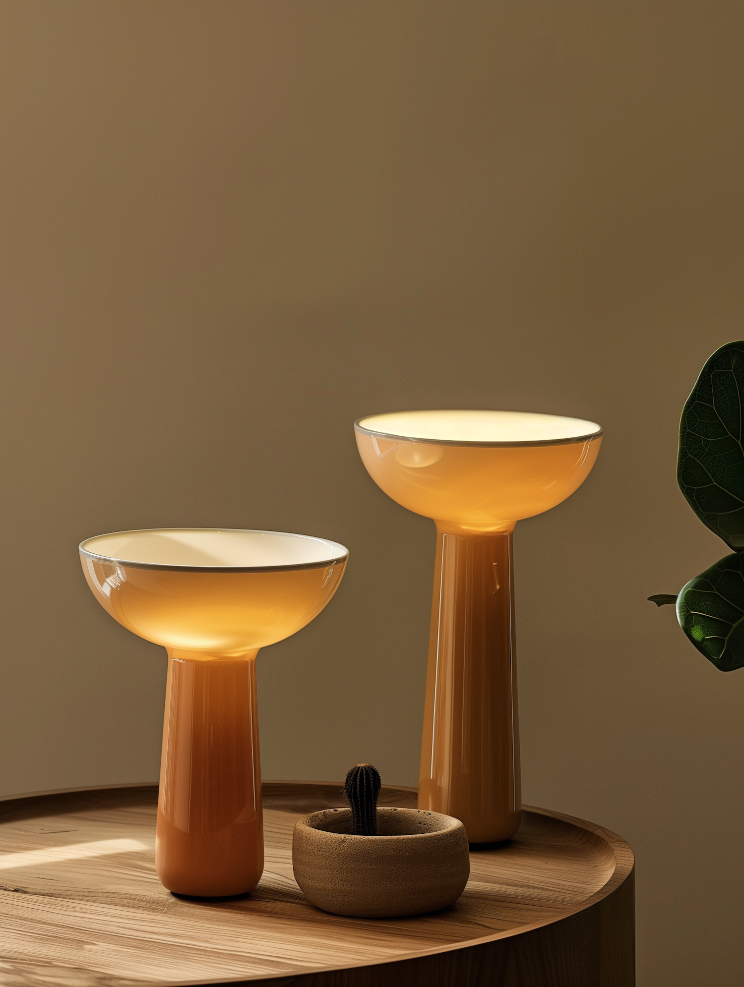 Two amber table lamps with a sleek design on a wooden table, paired with a small cactus planter and a neutral beige background.