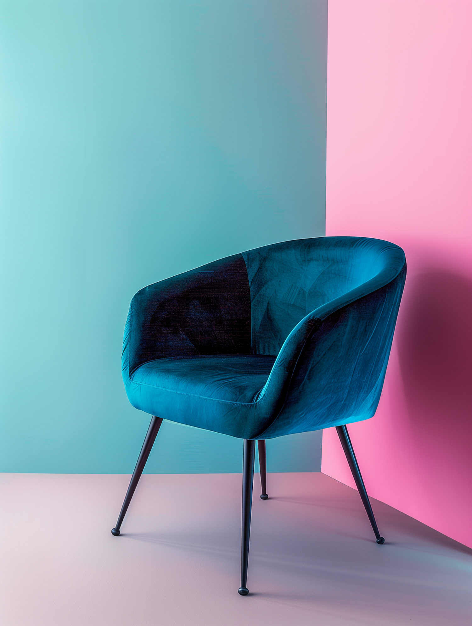 Modern teal velvet chair with black legs against a vibrant turquoise and pink background, perfect for contemporary interiors.