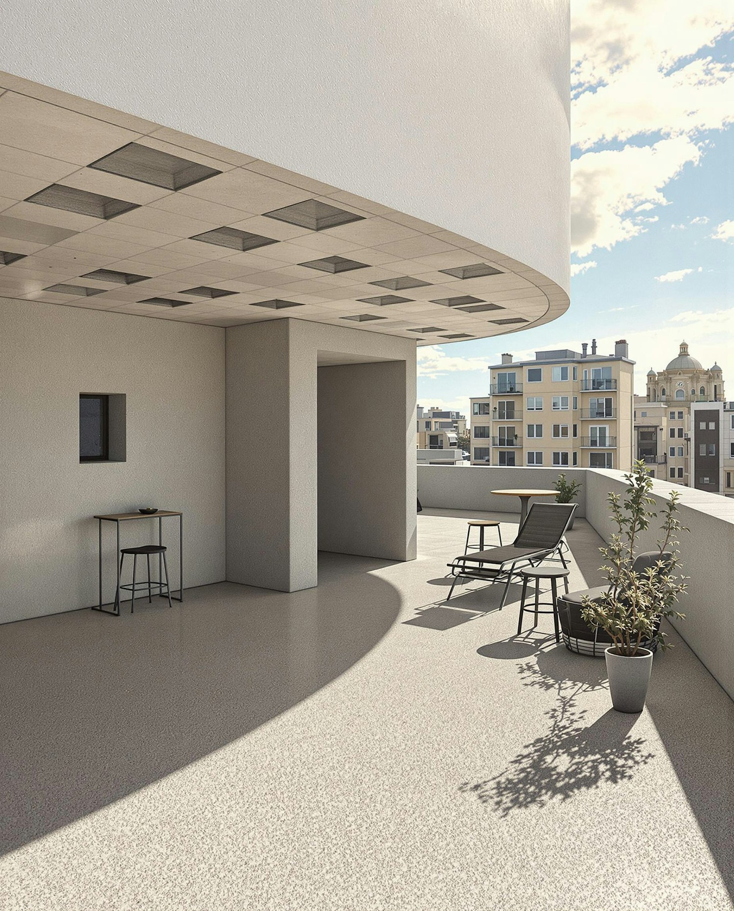 Modern terrace with sleek furniture, potted plants, and a geometric ceiling design, overlooking urban apartments under a sunny sky.