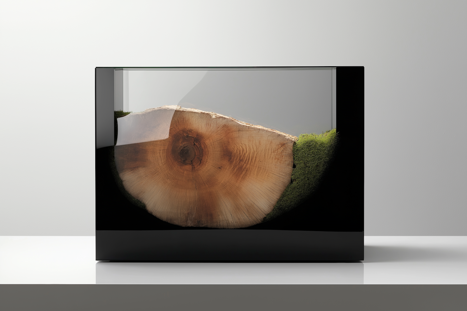 Minimalist terrarium with a tree trunk cross-section and moss in a sleek black frame, perfect for modern decor enthusiasts.