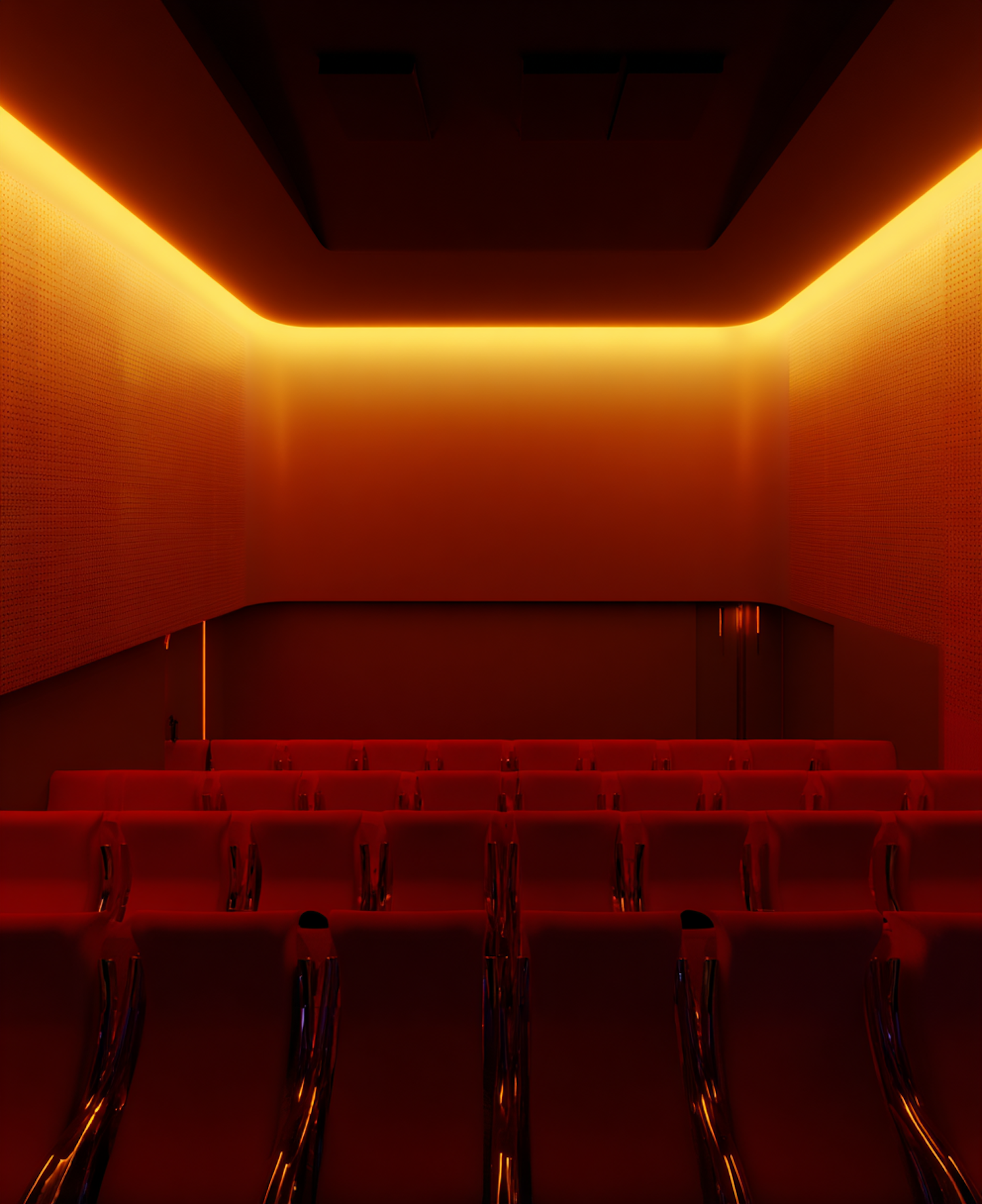 A modern theater room with red seats and warm orange lighting, creating a cozy and inviting atmosphere.