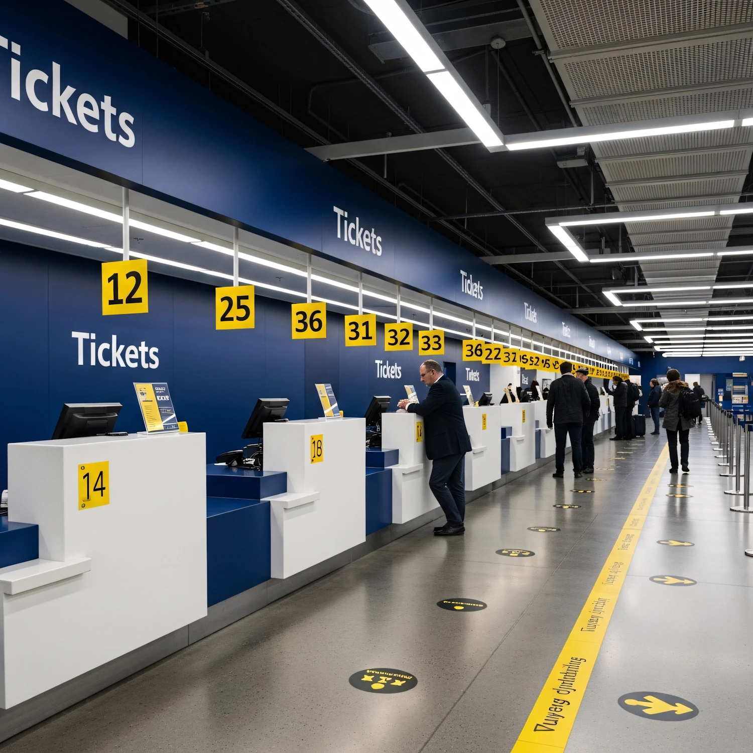 Modern ticket counter area with numbered desks, blue and white decor, and people interacting with staff. Bright and organized setting.