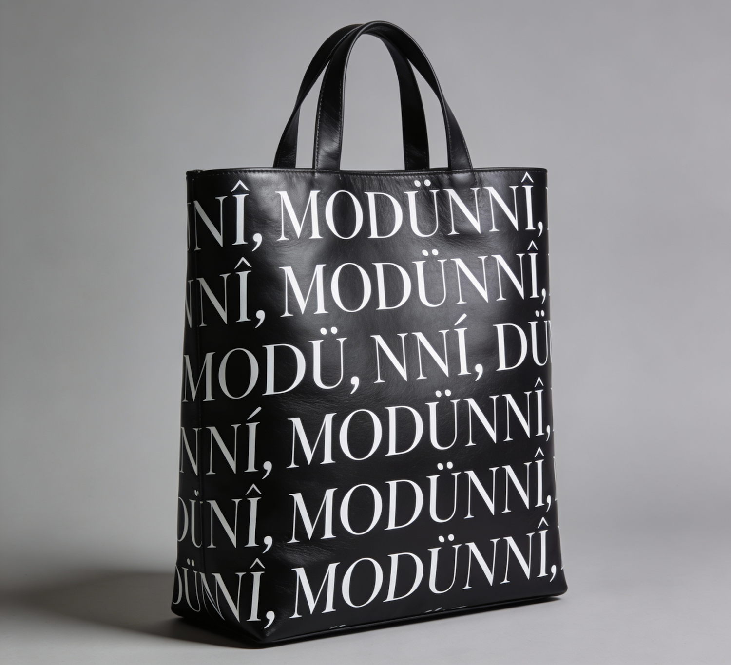 Design a structured tote bag made from soft‑sheen black leather with a subtle, refined luster. Cover the entire surface with a continuous all‑over print of the word “MODÙNNÌ,” written repeatedly as if handwriting across a sheet of paper. The text should flow in long horizontal lines; when a line reaches the edge of the bag, it breaks naturally and continues on the next line from the exact point where it stopped. Maintain a consistent rhythm, with occasional natural fragments such as “MODÙ,” “NNÌ,” or “DÙNNÌ” appearing at line breaks. Use a clean uppercase serif font printed in matte white for crisp contrast against the black leather. The overall effect should feel organic, continuous, and typographically expressive. Photograph the bag against a neutral backdrop to highlight the material and the flowing text pattern.