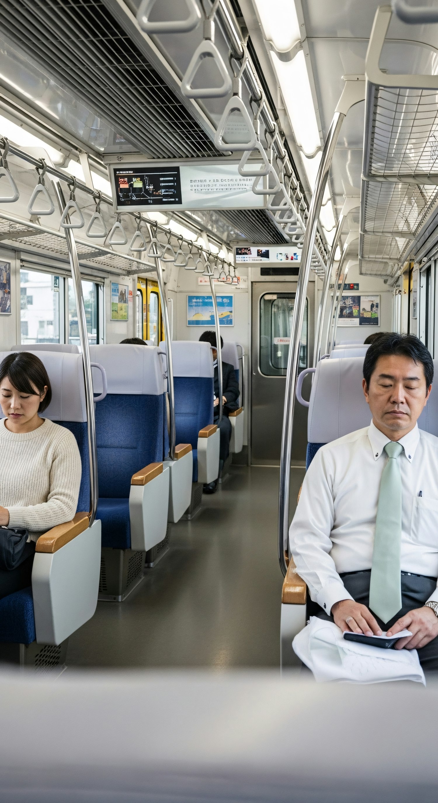 Modern train interior with passengers seated in blue and white seats, one using a phone and another resting. Clean and organized design.