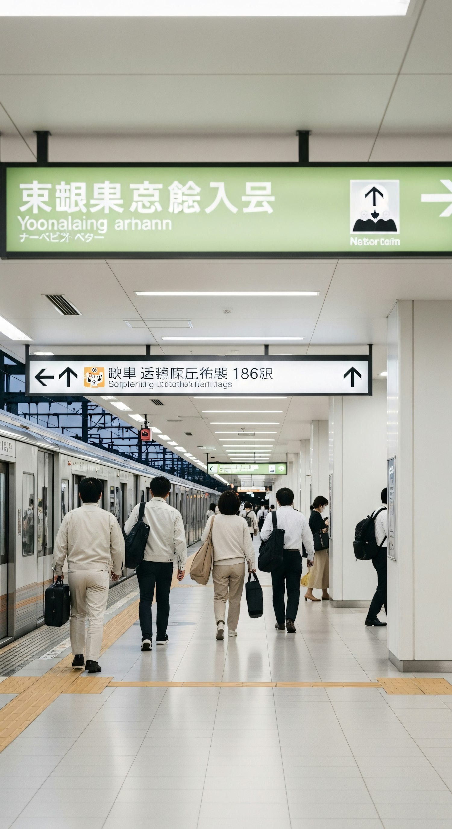 A clean, modern train station platform with people walking and clear directional signs in multiple languages.