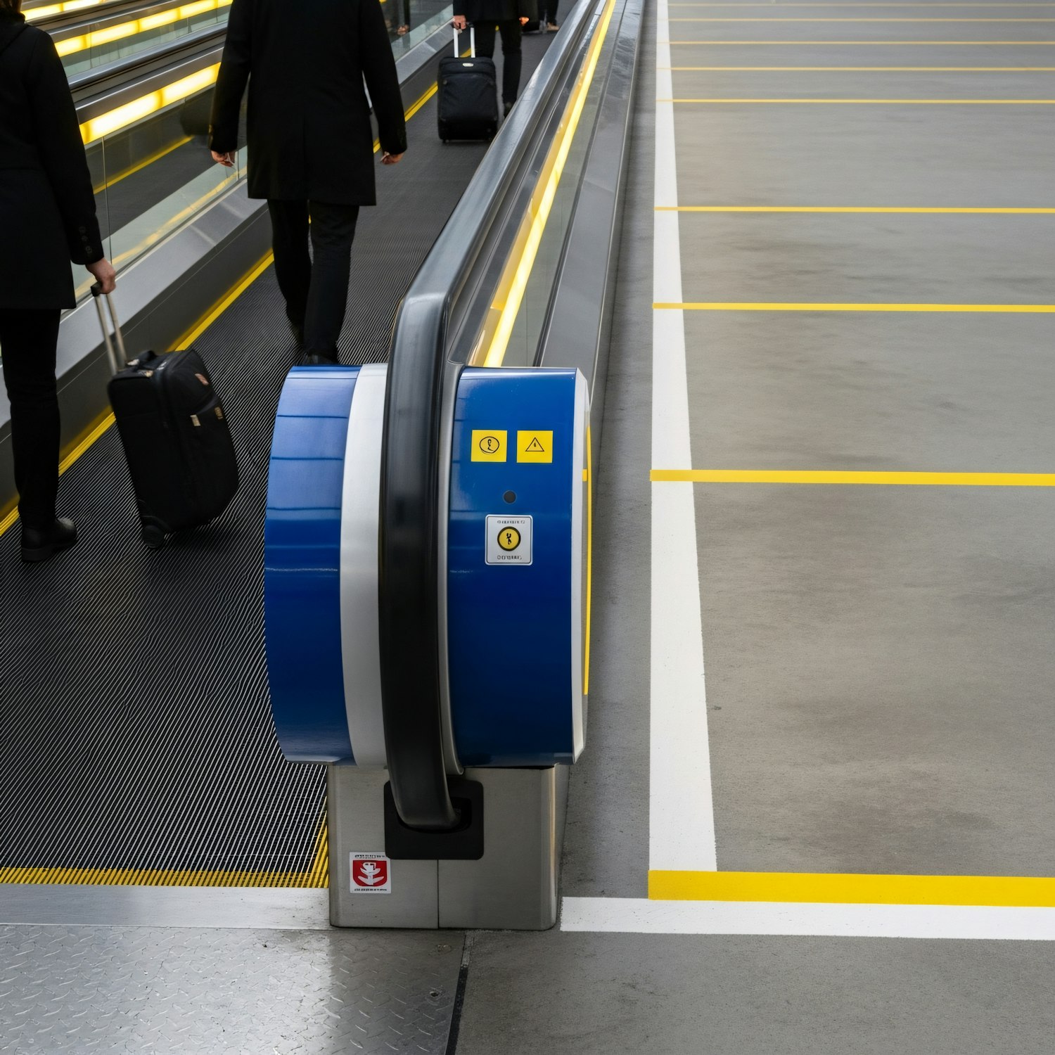 A moving walkway in a modern terminal with travelers pulling suitcases, bordered by yellow safety lines and a sleek control panel.