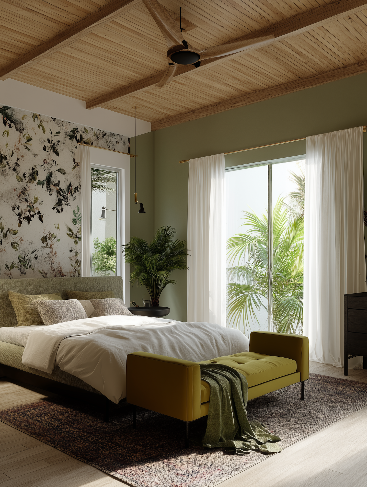 Modern bedroom with tropical vibes, featuring a floral accent wall, mustard bench, and lush greenery outside the sliding glass doors.
