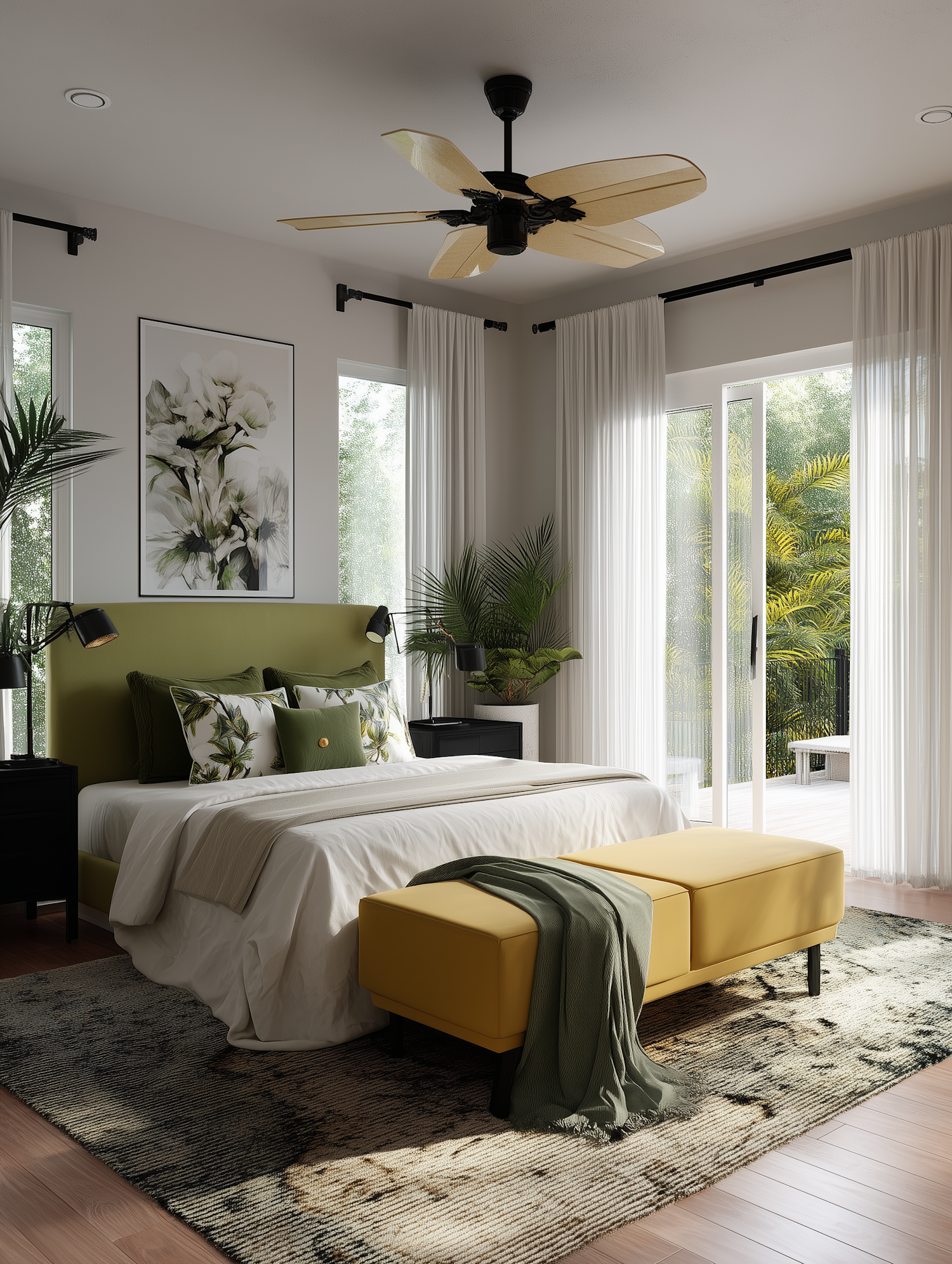 Modern bedroom with green and yellow accents, tropical decor, and lush outdoor views through sliding glass doors.