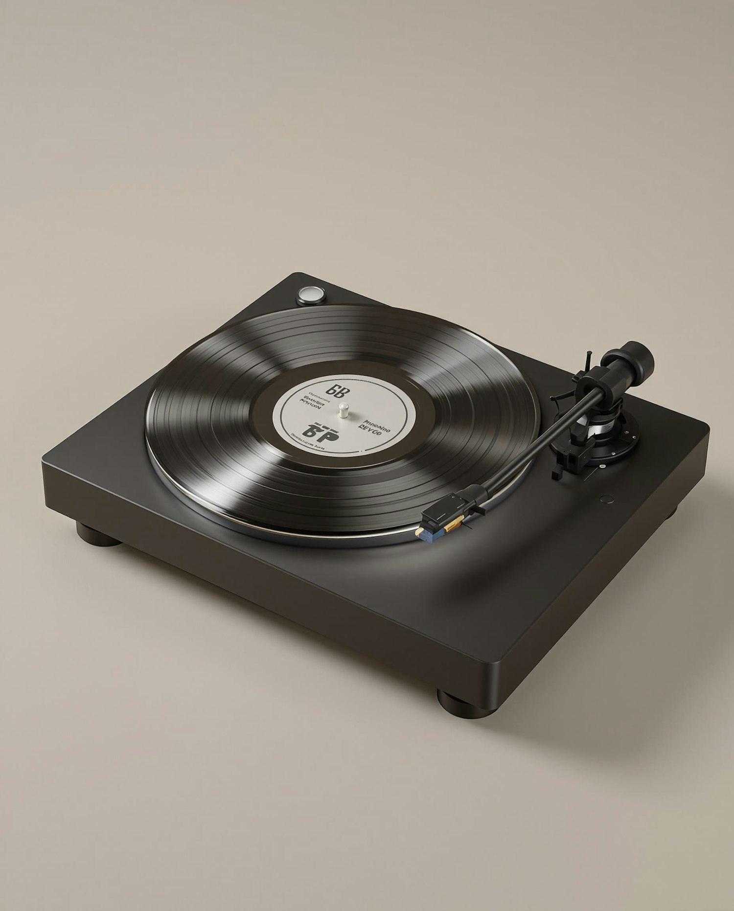 Modern matte black turntable with a clear vinyl record on top, placed on a grey-beige background with soft fall-off lighting, minimalist composition and subtle vintage color grading, timeless product styling