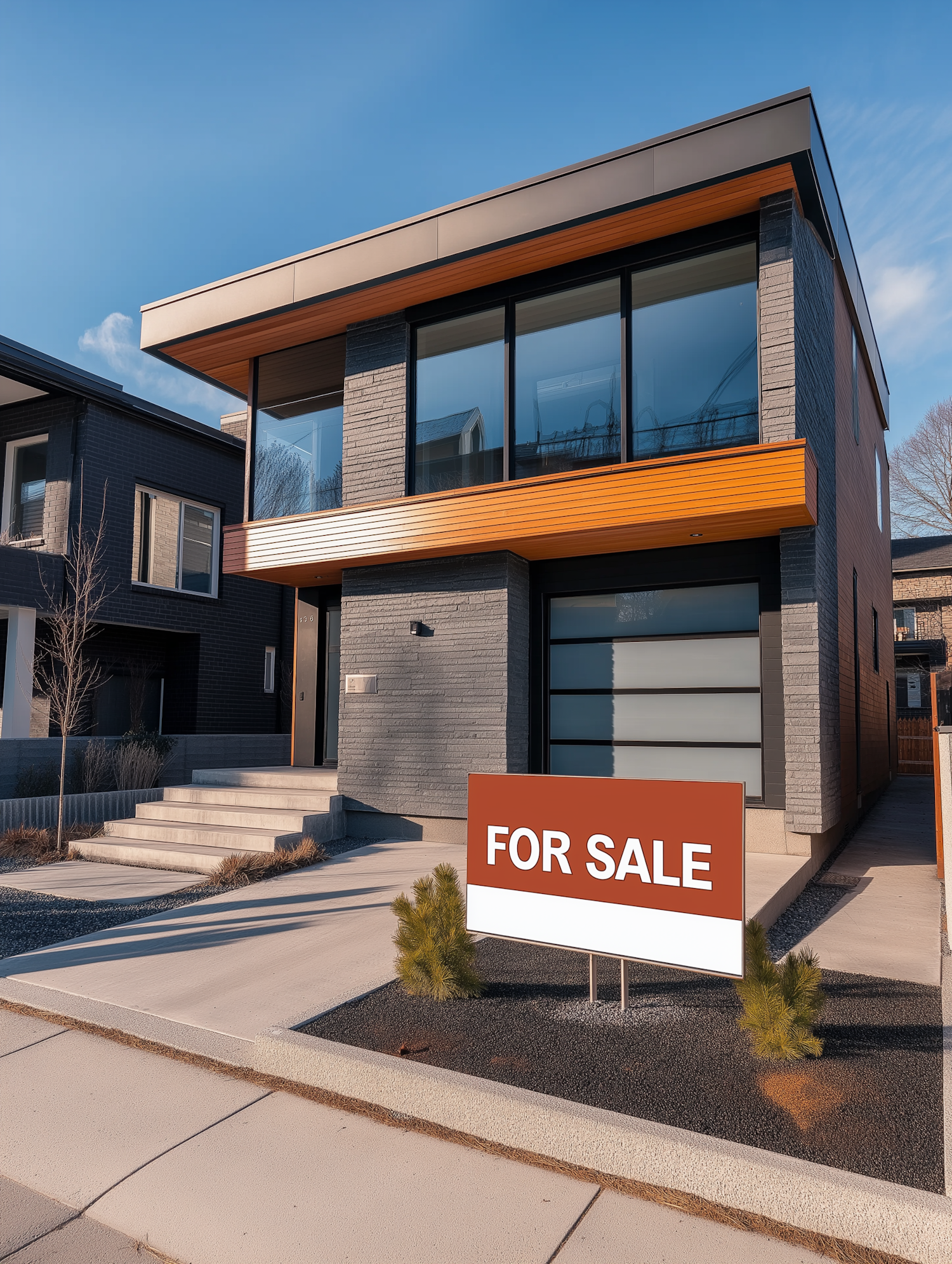Modern two-story house with large windows and a 'FOR SALE' sign, featuring dark gray brick and wooden accents under a clear blue sky.