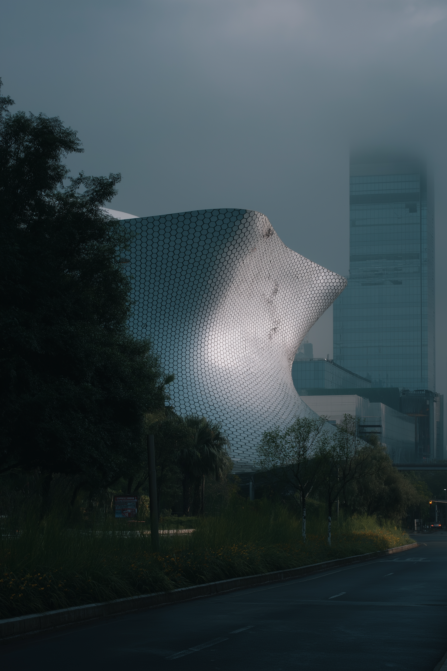 A stunning modern building with a hexagonal facade stands amidst greenery, with a misty skyscraper in the background.