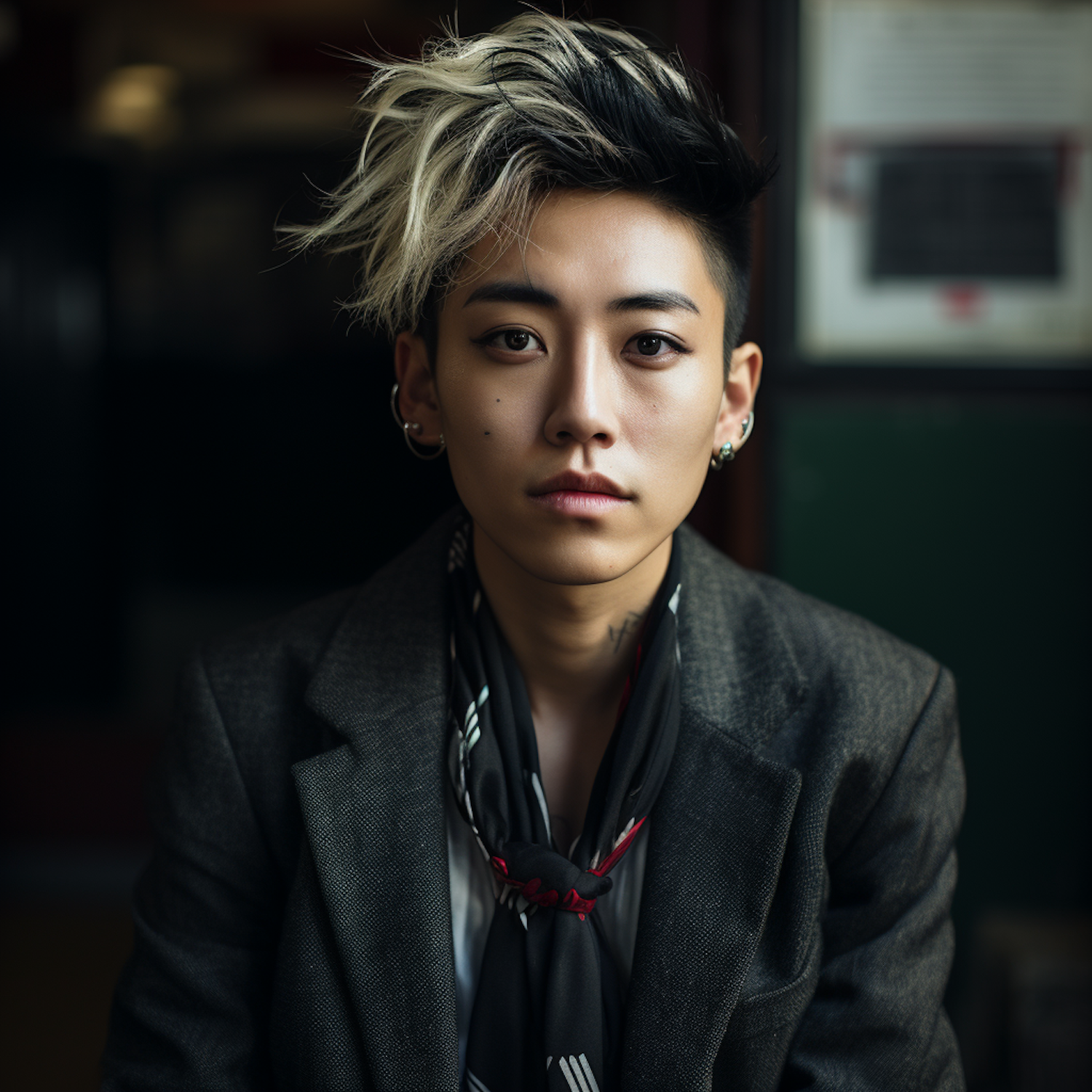 Stylish portrait of an Asian individual with striking black and blonde hair, wearing a dark blazer and scarf, exuding modern elegance.