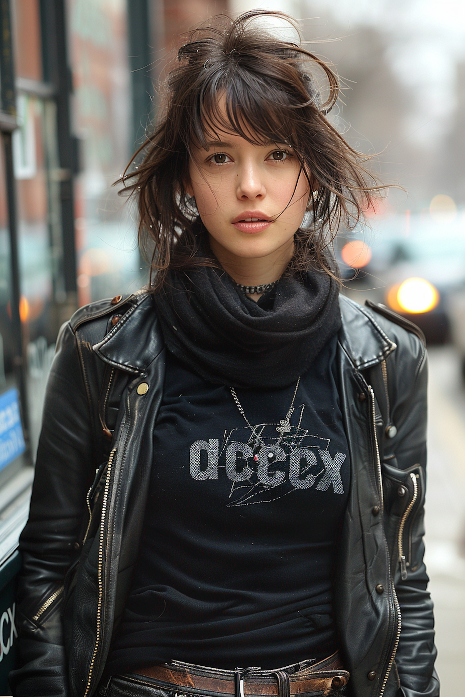 Stylish woman with tousled hair in a leather jacket on a city street, exuding confidence and urban chic.
