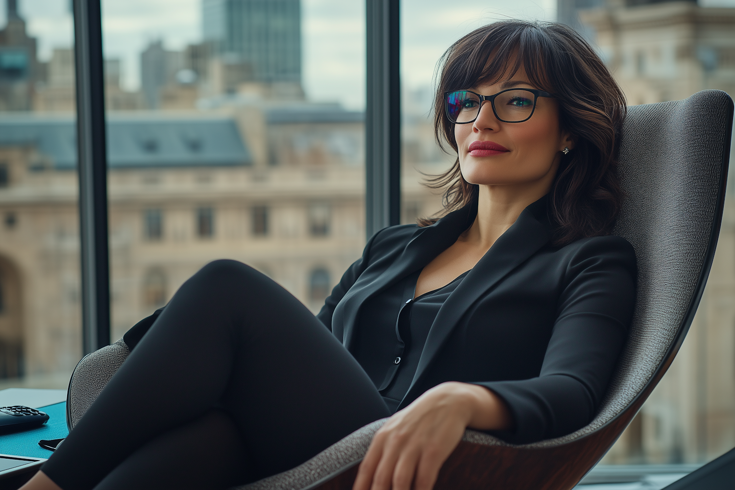 Confident woman in a sleek black suit and glasses, seated in a modern office with urban views, exuding professionalism and poise.