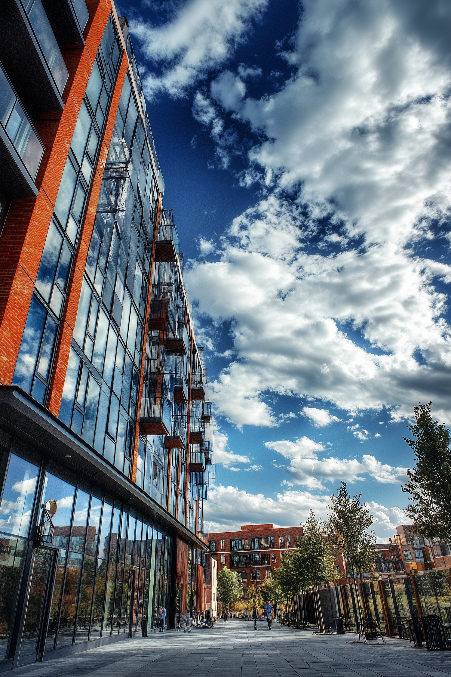 Modern urban architecture with red brick and glass, vibrant blue sky, and a lively walkway with people and trees.