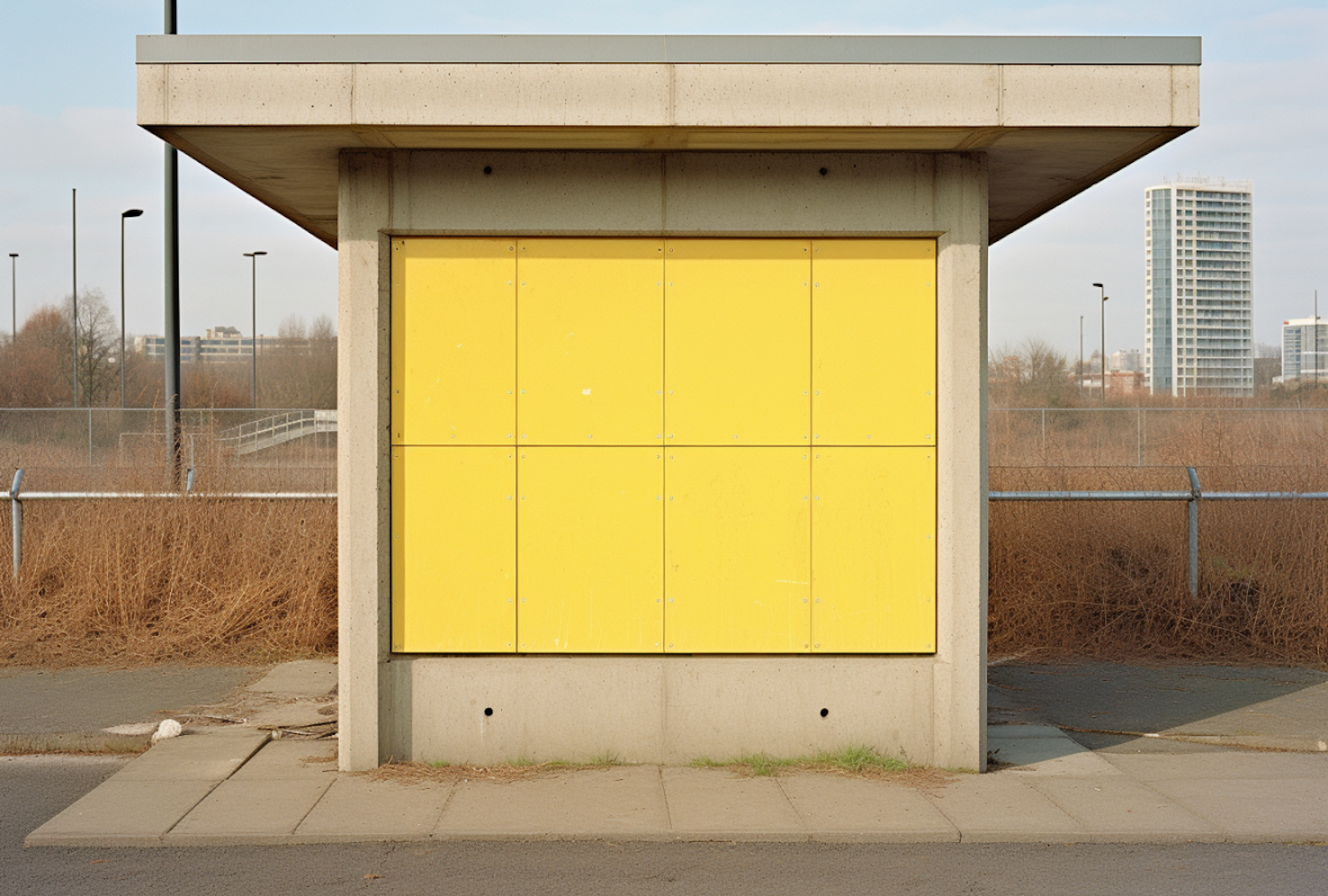 Concrete structure with a bright yellow panel, set against an urban backdrop with a tall building and dry vegetation.