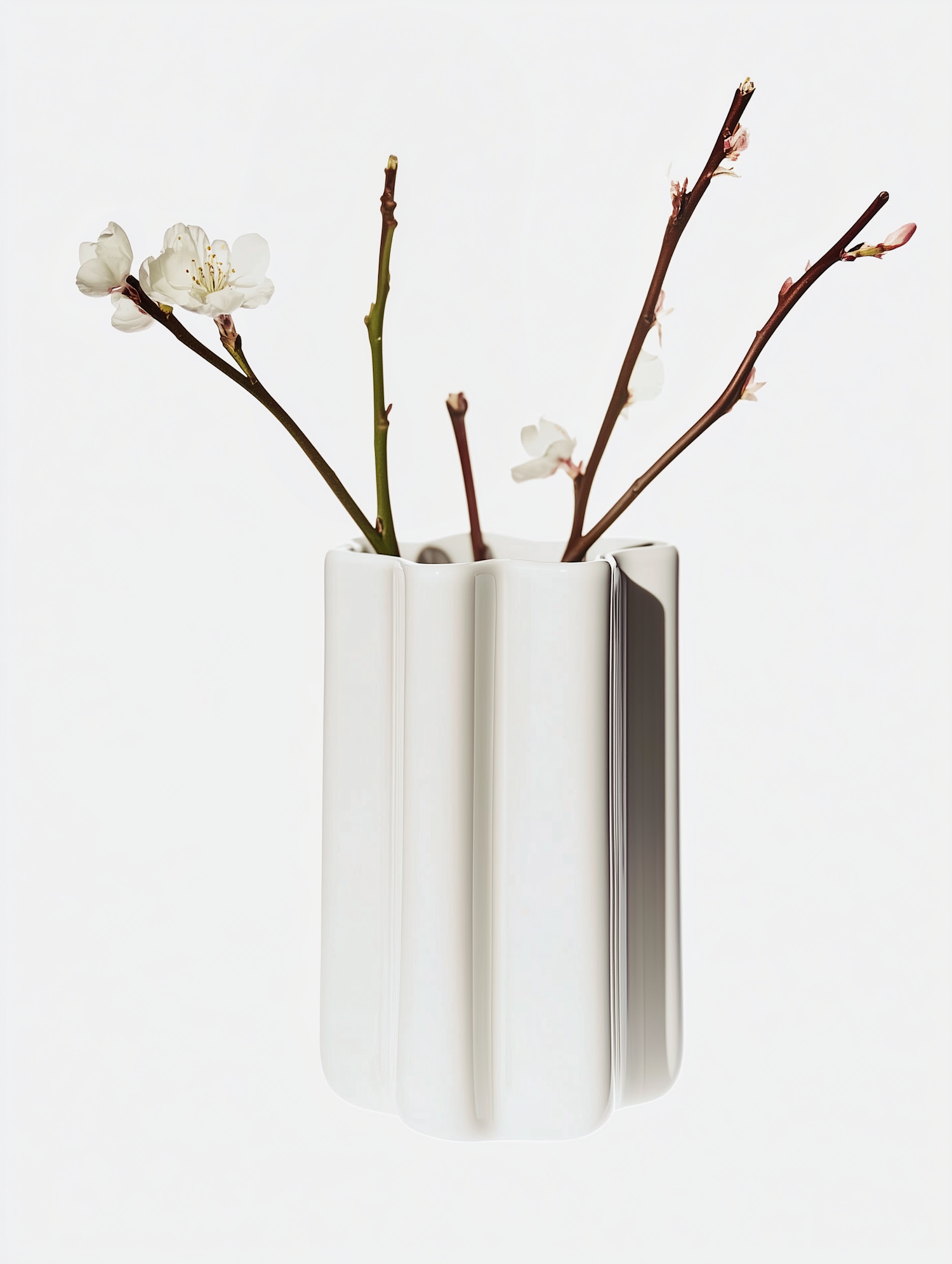 Elegant white vase with delicate blossoming branches, showcasing minimalist design and natural beauty.