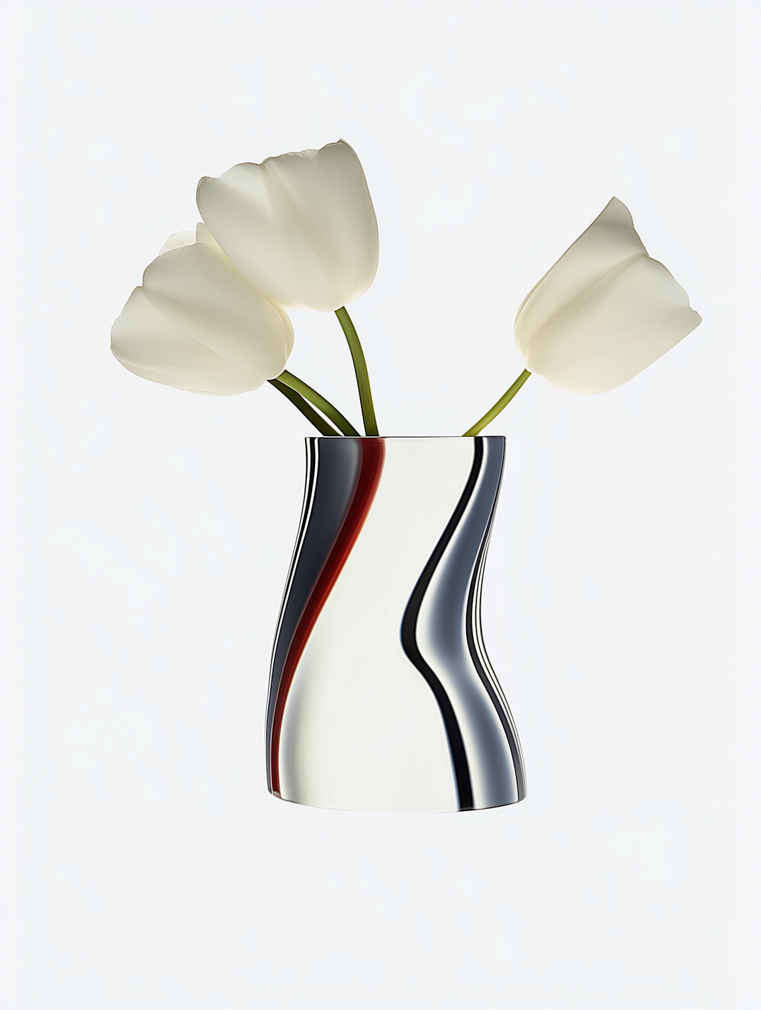 Modern vase with reflective surface holding three white tulips. Sleek design contrasts with soft petals, creating a minimalist aesthetic.