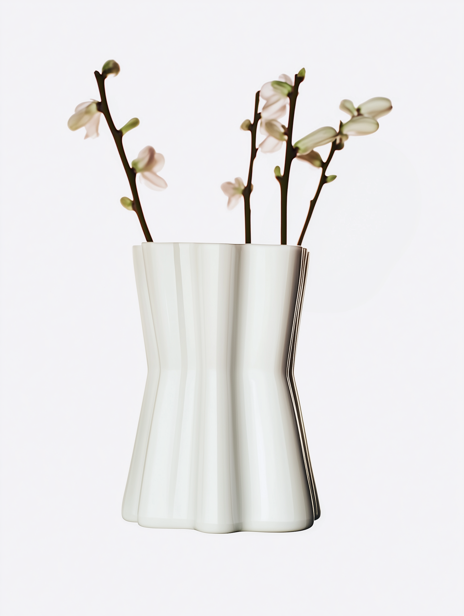 Elegant white vase with wavy design and delicate white flowers on branches, set against a plain background.