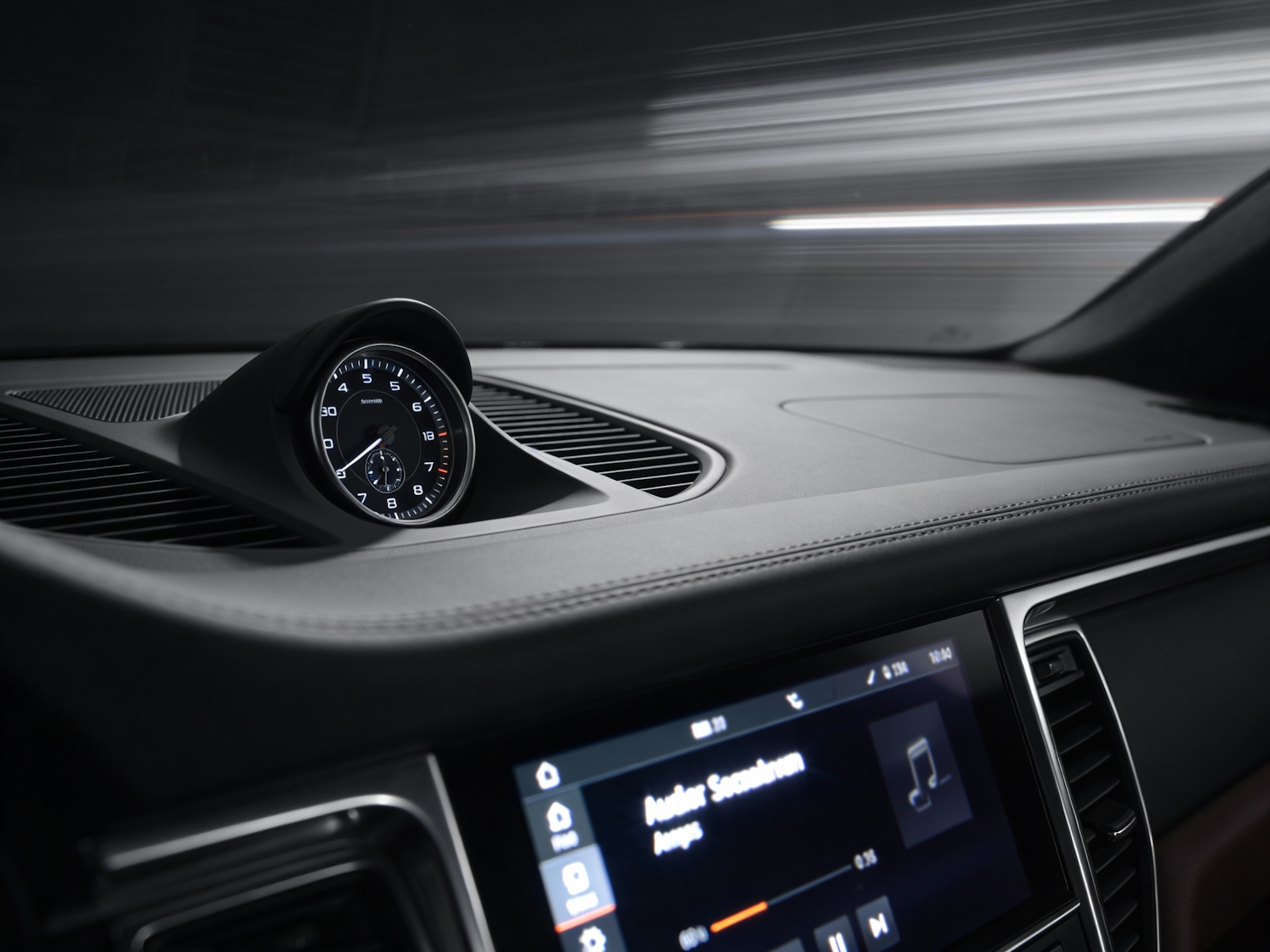 A luxury car dashboard featuring a sleek analog clock and a digital infotainment screen, showcasing modern design and functionality.