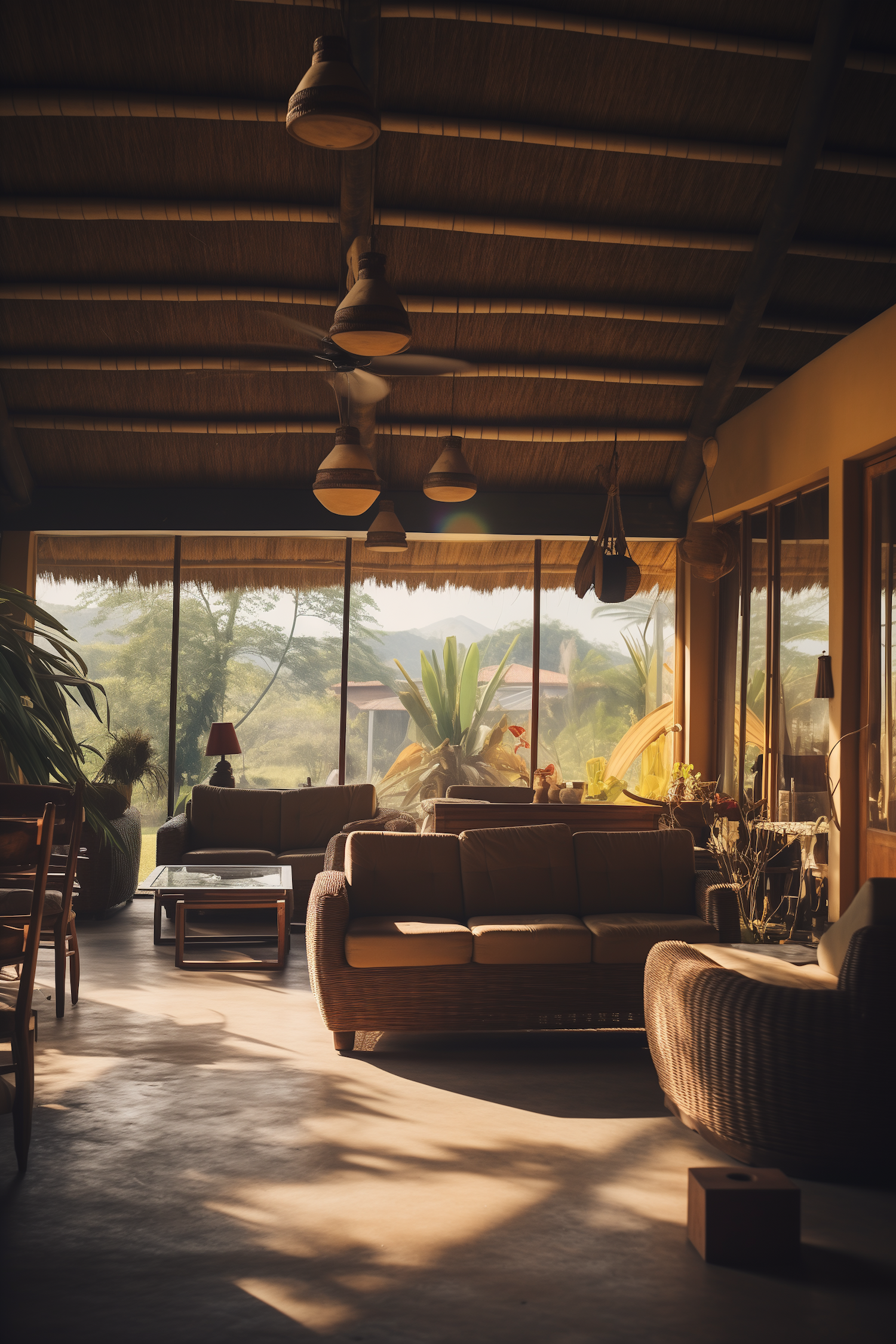 Cozy living room with wicker sofas, thatched ceiling, and tropical views through large windows. Warm, inviting ambiance.