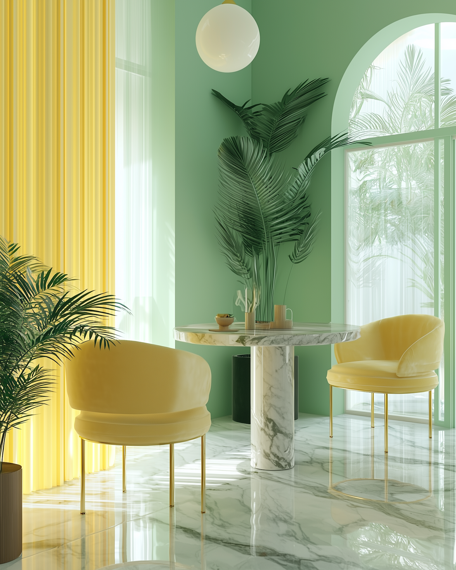 Bright modern interior with green walls, yellow chairs, marble table, and tropical plants. Perfect mix of elegance and vibrancy.