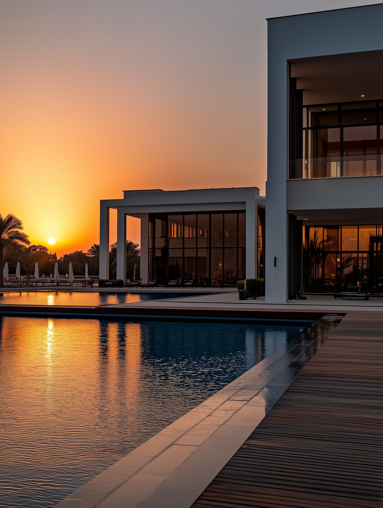 Modern villa at sunset with sleek architecture, a serene pool, wooden deck, and palm trees, creating a luxurious tropical retreat.