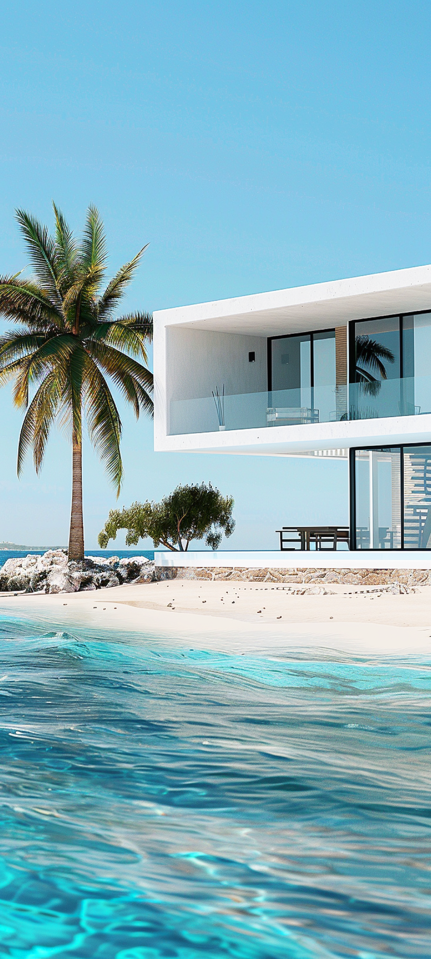 Modern beachfront house with glass windows, palm tree, and turquoise waters. Minimalist design and serene tropical setting.