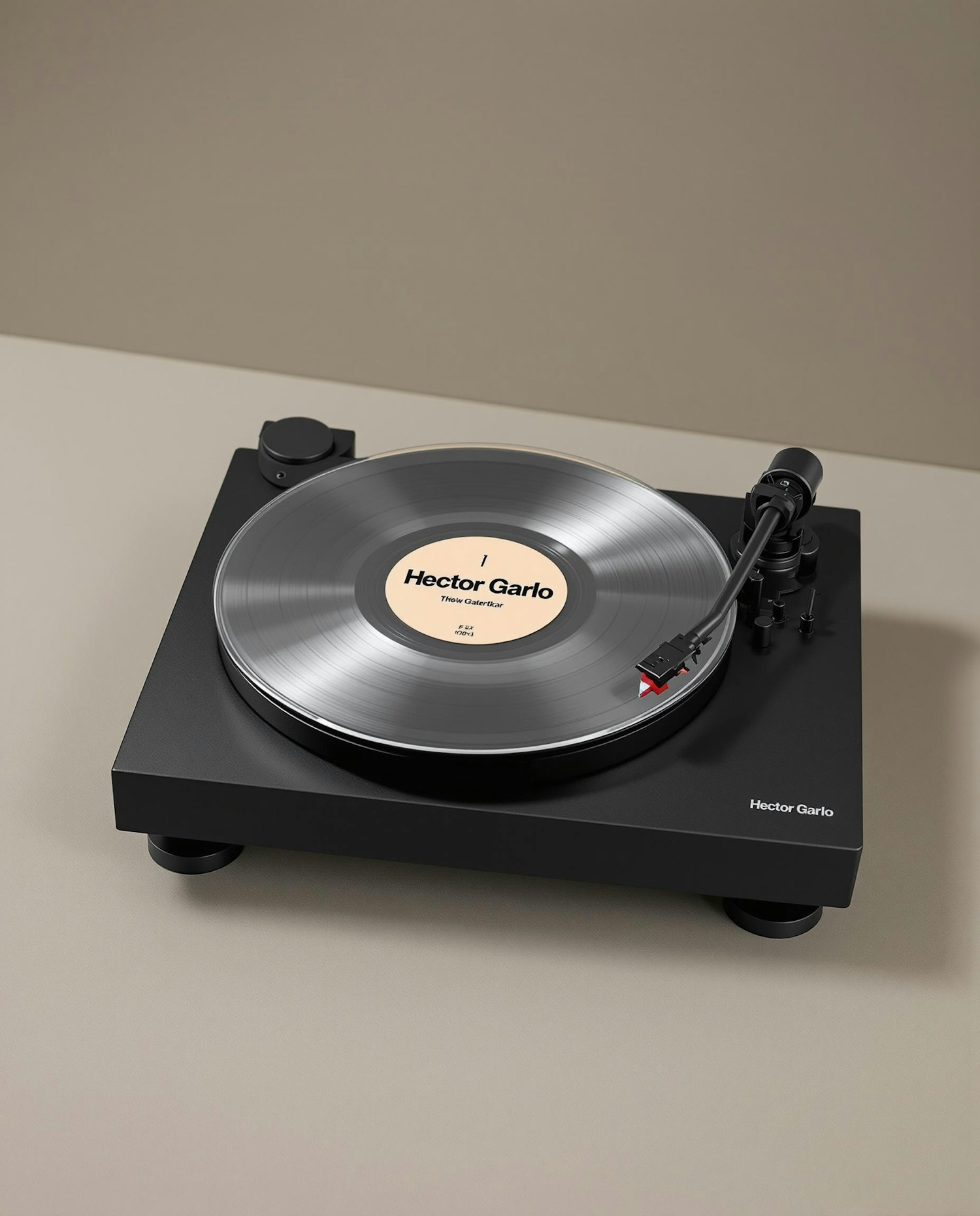 Minimalist black turntable with a spinning vinyl record labeled 'Hector Garlo', set against a neutral beige background.