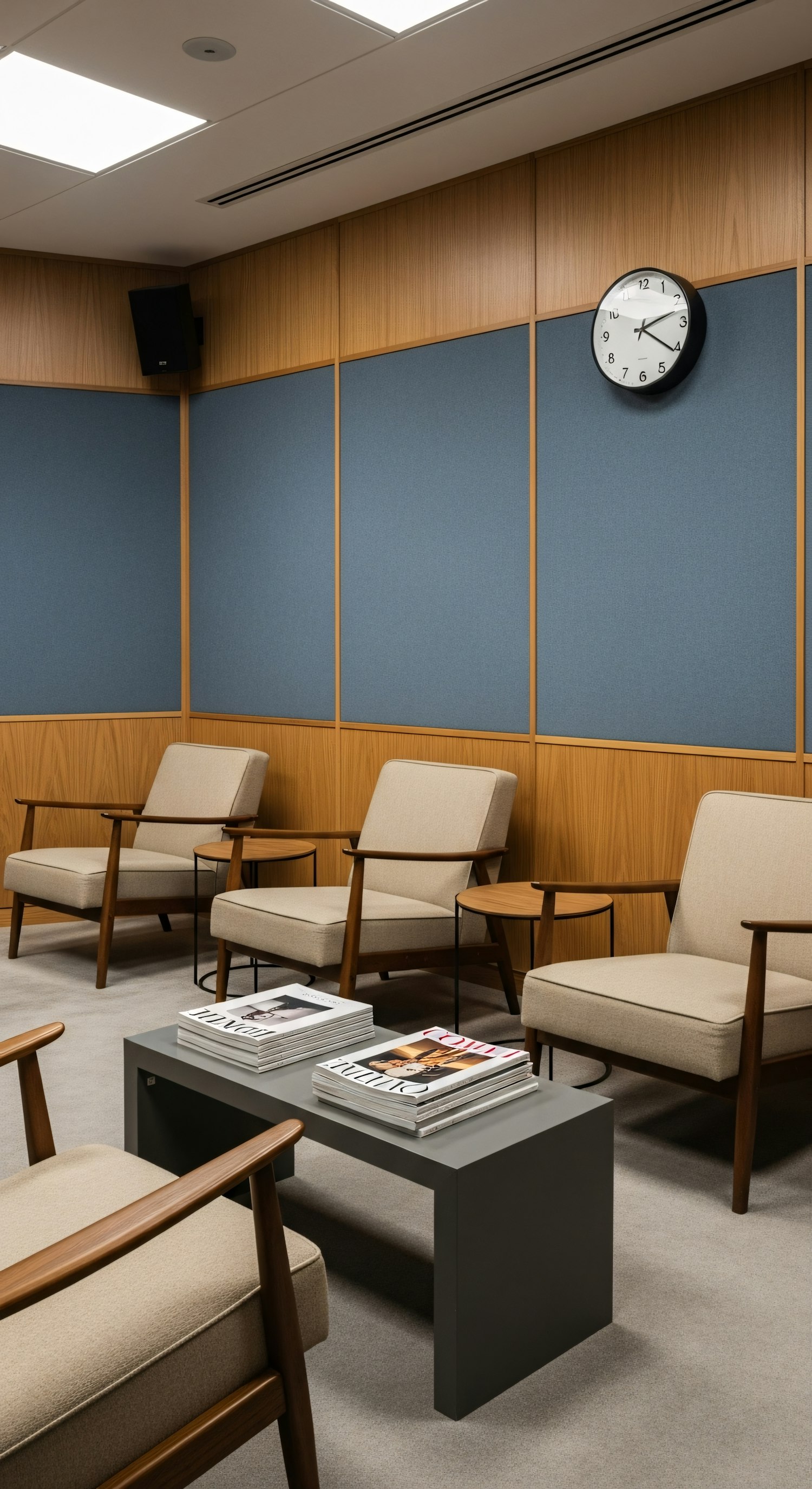 Modern waiting room with beige chairs, a gray coffee table, and wood-paneled walls with a clock. Sleek and professional design.