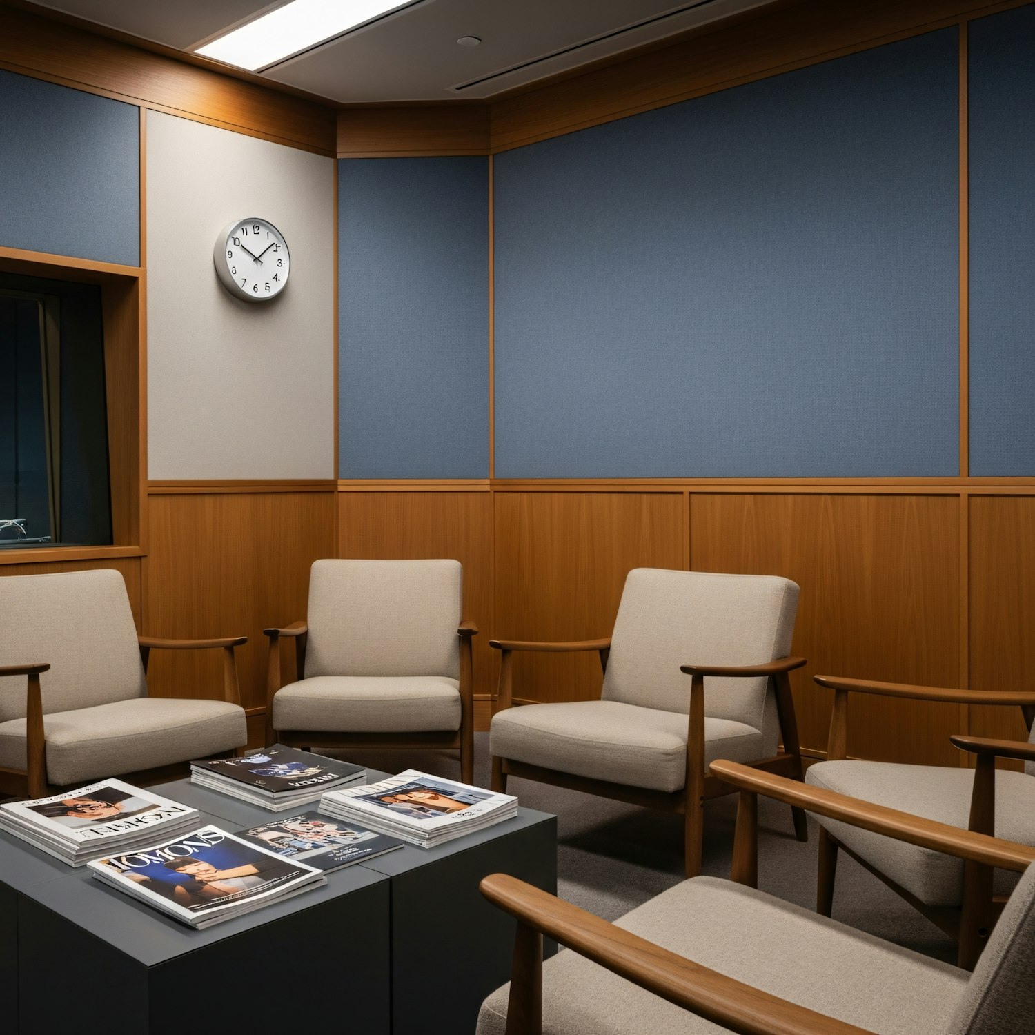 Modern waiting room with beige chairs, a black coffee table, and blue-paneled walls, creating a professional and welcoming atmosphere.
