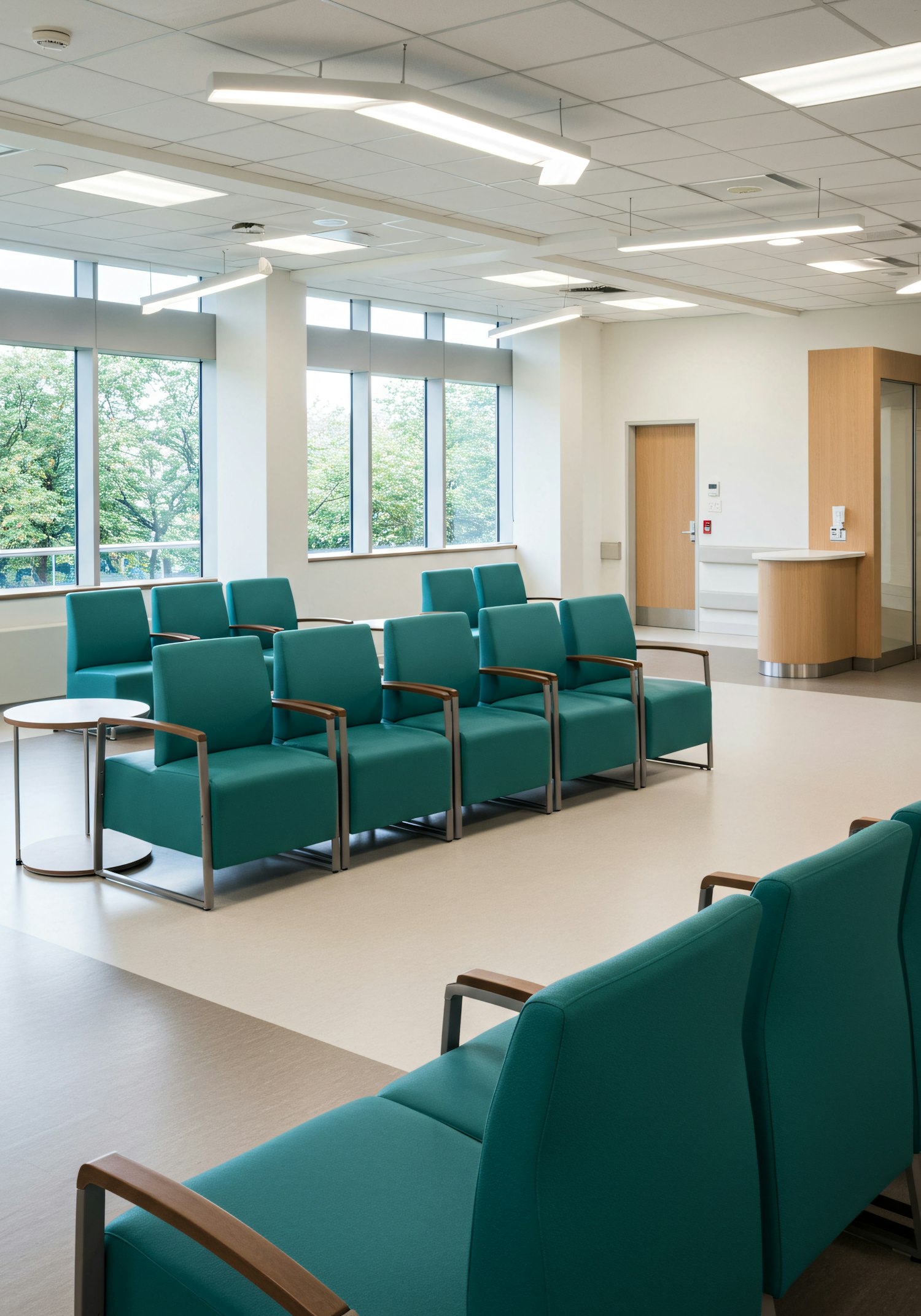 Bright and modern waiting room with teal chairs, large windows, and a clean, minimalist design. Perfect for healthcare or office spaces.