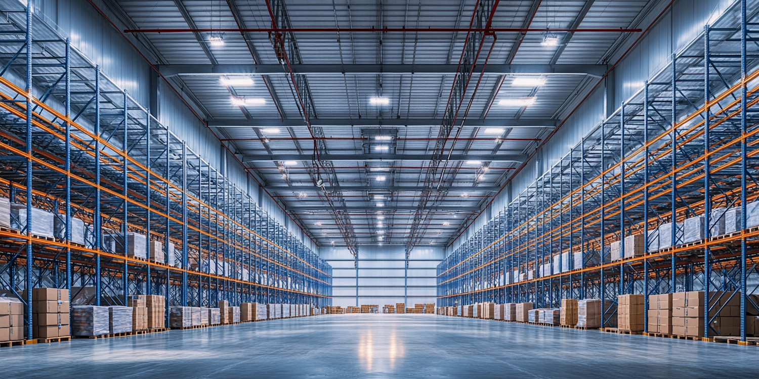 Spacious modern warehouse with high shelves, stacked boxes, and bright lighting, showcasing industrial efficiency and organization.