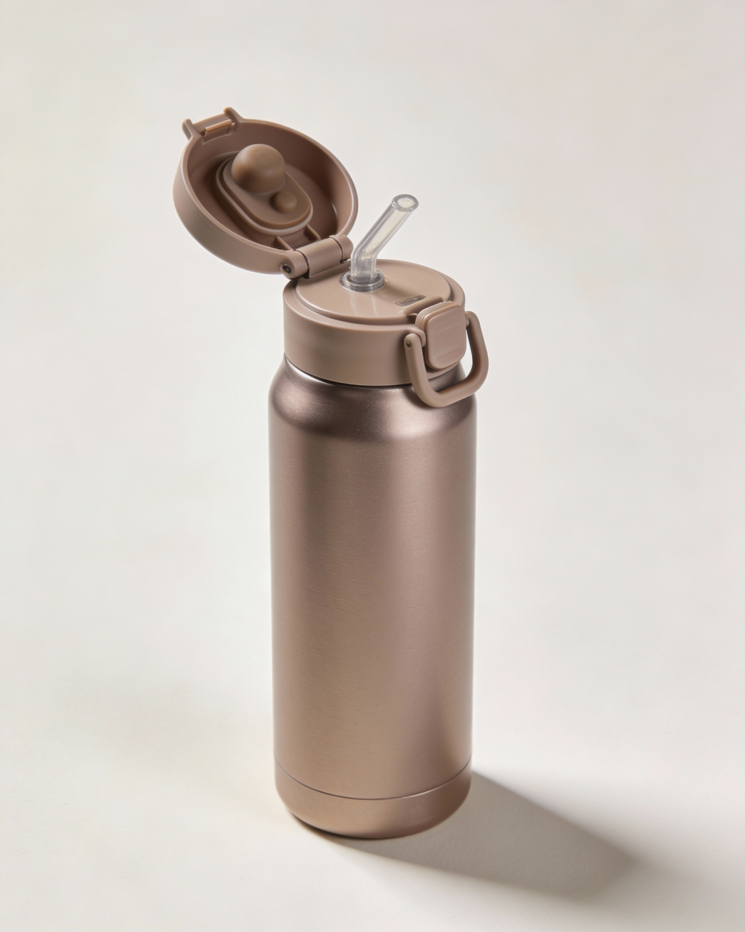 A premium stainless steel water bottle with a built-in straw lid and a small carry handle, neutral matte color (warm beige / taupe), minimal modern design, no logo, no text, clean studio packshot on a soft off-white background, realistic soft shadow, high-end product photography, quiet luxury aesthetic, sharp focus, ultra realistic, 4k