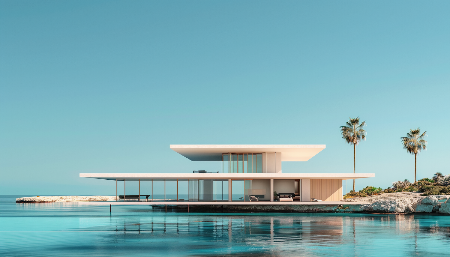 Modern minimalist house by tranquil water, featuring sleek design, glass walls, and palm trees under a clear blue sky.