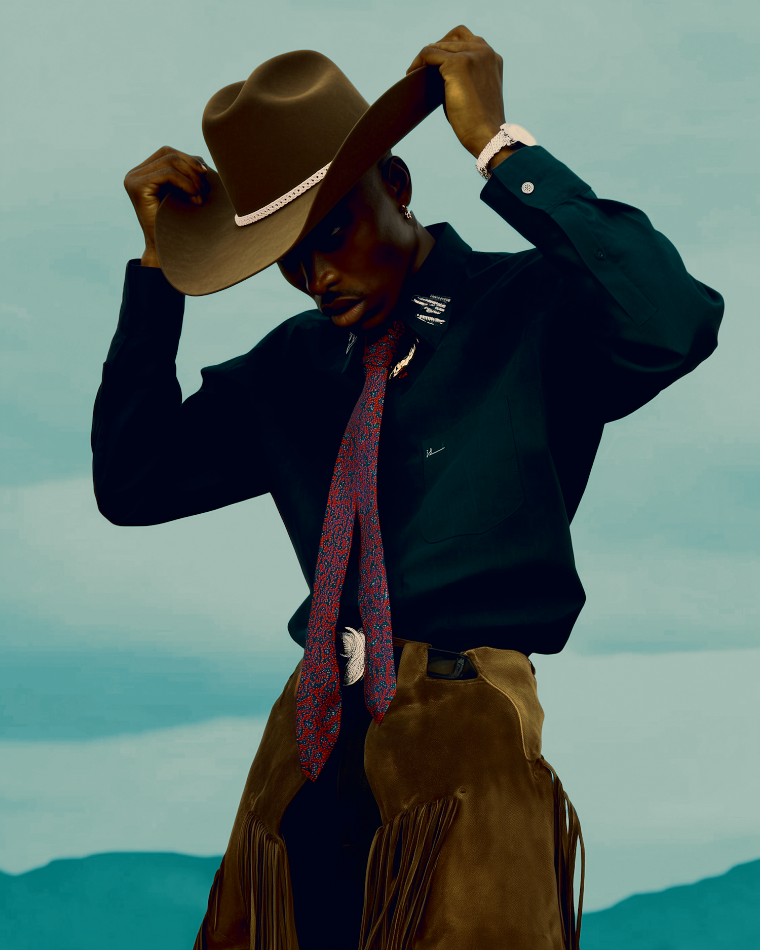 Stylish individual in Western-inspired attire adjusts a cowboy hat against a serene sky backdrop, blending tradition with modern fashion.