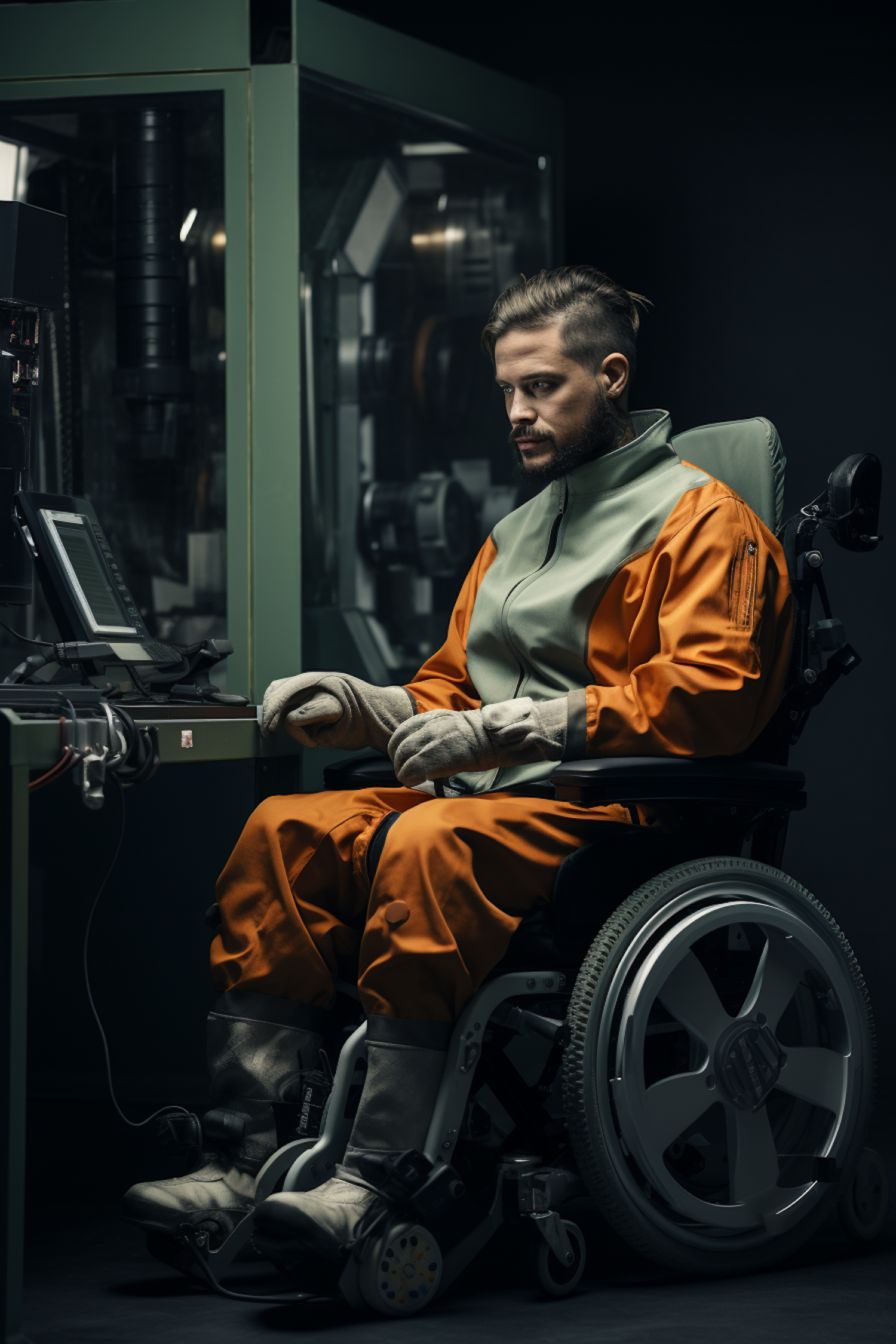 Man in wheelchair wearing protective suit in industrial setting, focused on control panel. Dim lighting adds a serious tone.