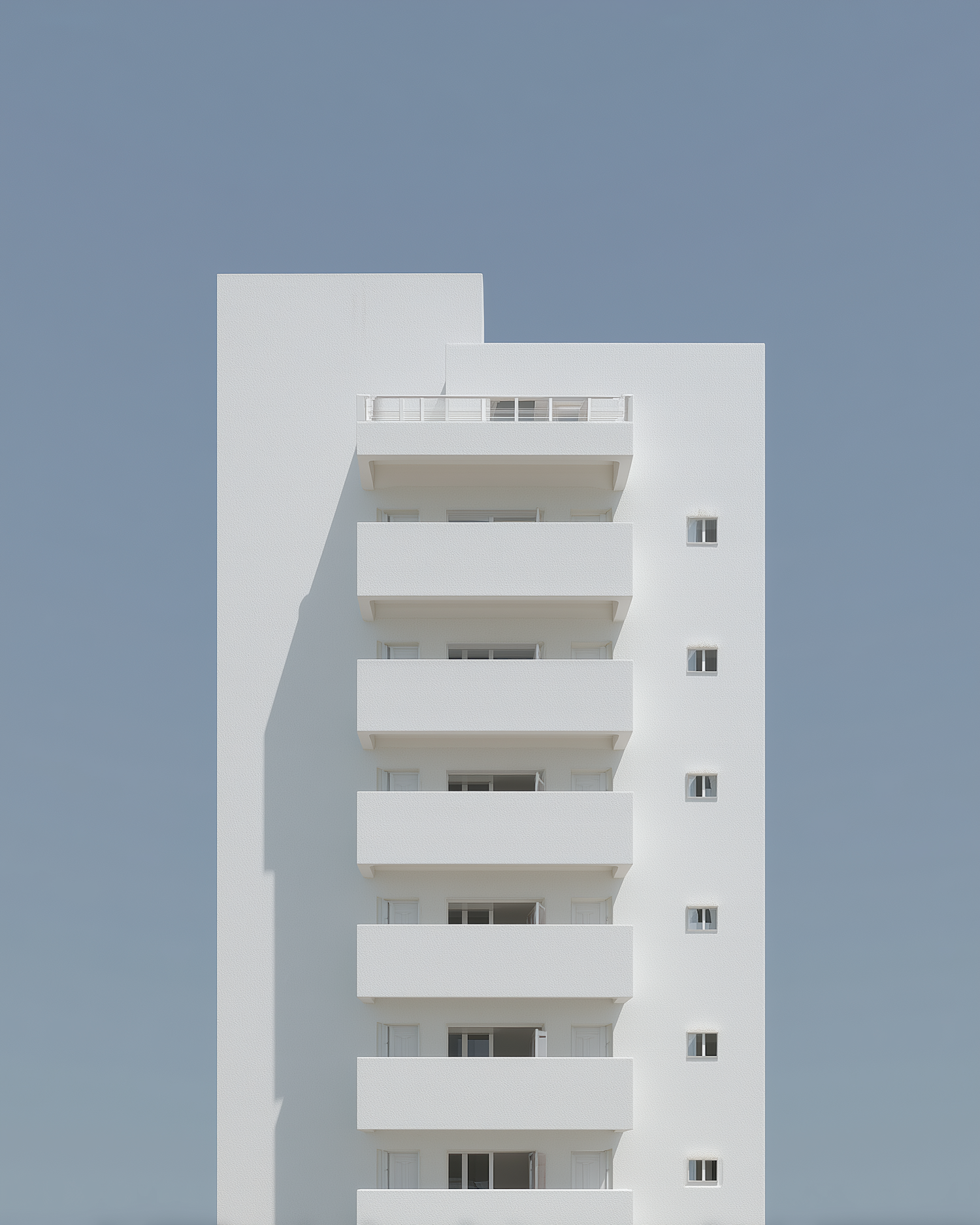 Minimalist white apartment building with balconies against a clear blue sky, showcasing modern architecture and clean lines.