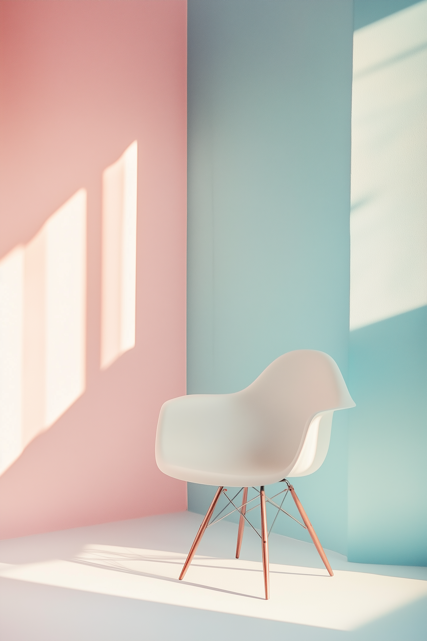 Modern white chair with wooden legs in a pastel pink and teal room, bathed in soft sunlight and shadows for a minimalist vibe.