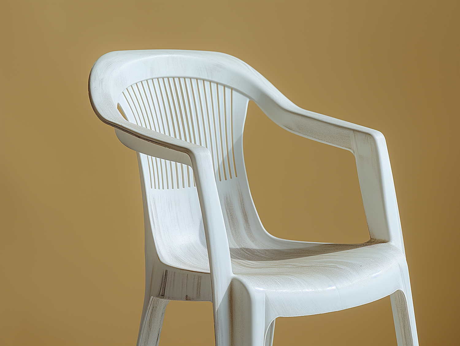 Minimalistic image of a white plastic chair against a muted yellow background, highlighting its simple design and texture.