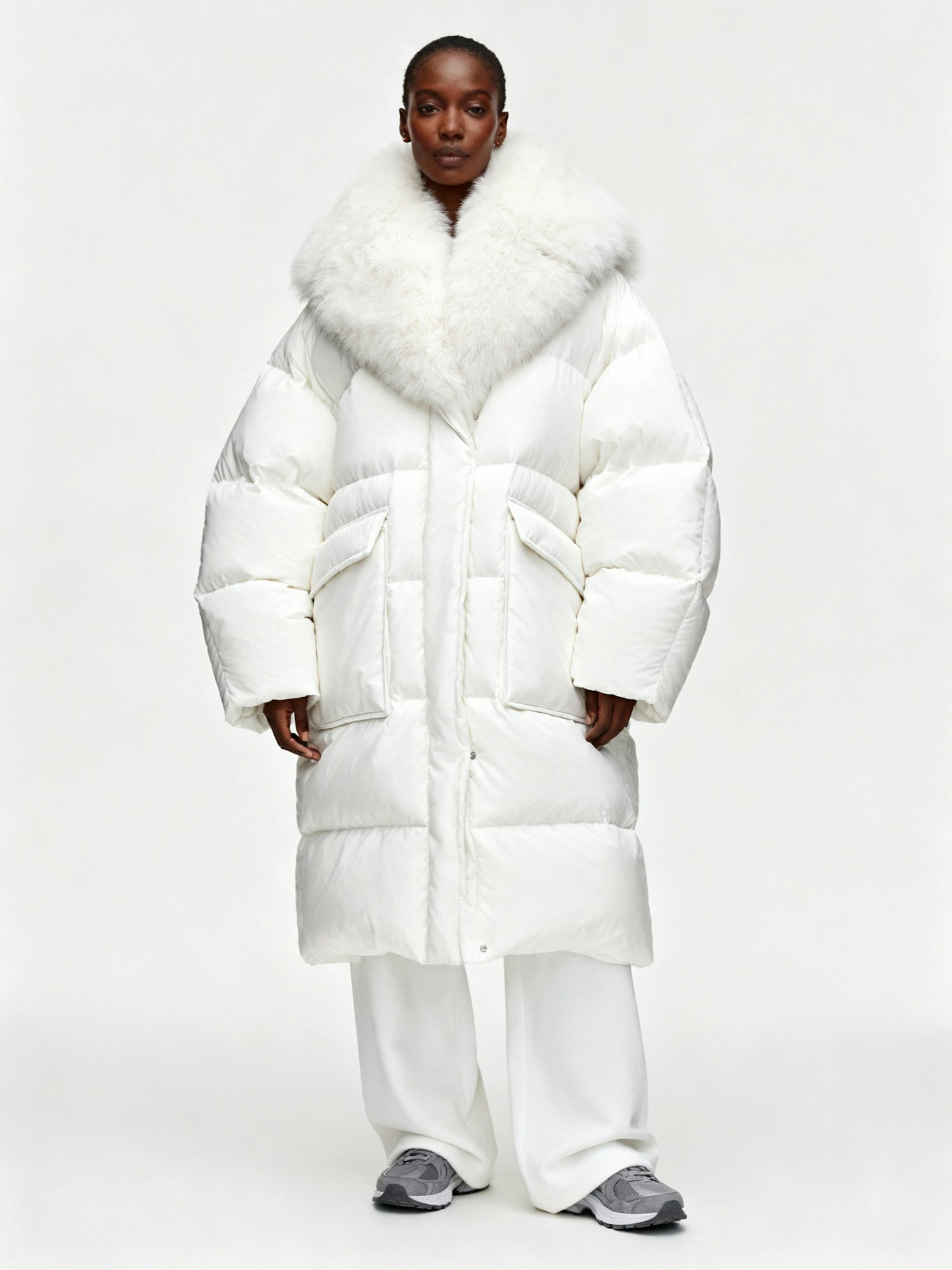 A close-up editorial portrait of a poised Black woman wearing an oversized white puffer coat with a voluminous fur collar, large sleeves, and deep pockets. She pairs it with loose-fitting white pants and gray sneakers. The framing is tight, emphasizing her glowing, hyperrealistic skin and serene expression. The monochromatic outfit contrasts beautifully with her rich brown skin tone, while the plain backdrop and soft, diffused lighting highlight texture, volume, and mood. The overall aesthetic is minimalist, winter-forward, and quietly powerful.